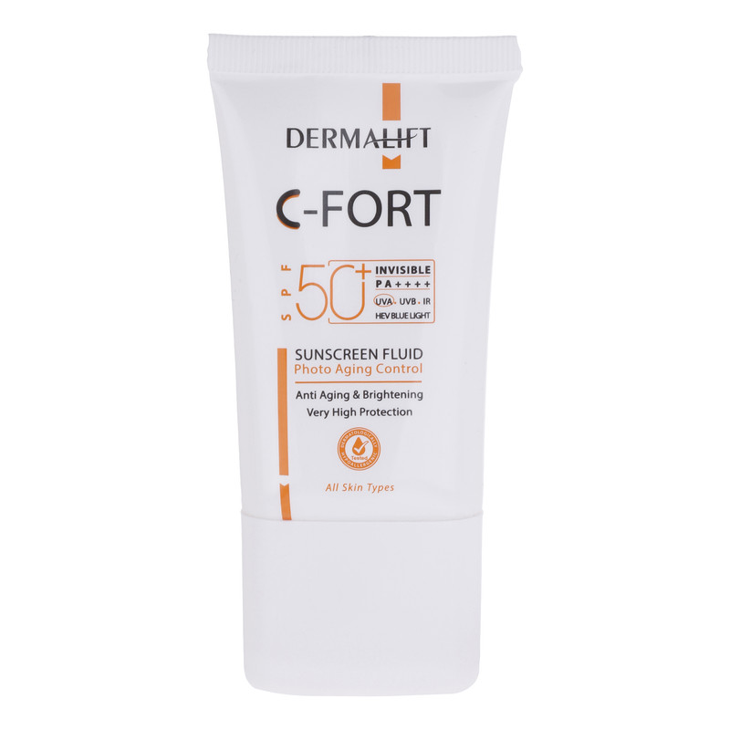 فلوئید ضد آفتاب بدون رنگ درمالیفت SPF 50 مدل C-FORT محافظ UVA و UVB مناسب برای انواع پوست حاوی ویتامین C حجم 40 میلی لیتر