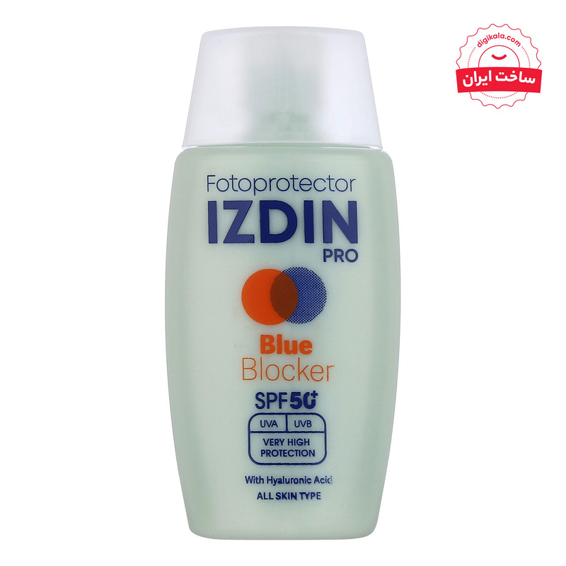 فلوئید ضد آفتاب بیرنگ صورت و گردن ایزدین پرو SPF 50 مدل Blue Blocker محافظ در برابر اشعه UVA و UVB مناسب برای انواع پوست حجم 50 میلیلیتر