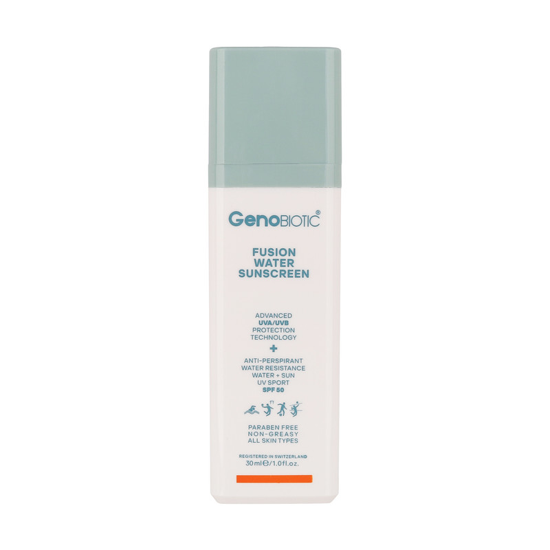 کرم ضدآفتاب بیرنگ ژنوبایوتیک، مدل Fusion water، حاوی محافظ UVA ،UVB، ضدآب، فاقد چربی، بدون پارابن، حاوی ویتامین E و هیالورونیک اسید مناسب انواع پوست، حجم 30 میلیلیتر
