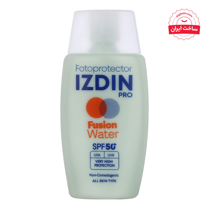 فلوئید ضد آفتاب بیرنگ صورت و گردن ایزدین پرو SPF 50 مدل Fusion Water محافظ در برابر اشعه UVA و UVB مناسب برای انواع پوست حجم 50 میلیلیتر