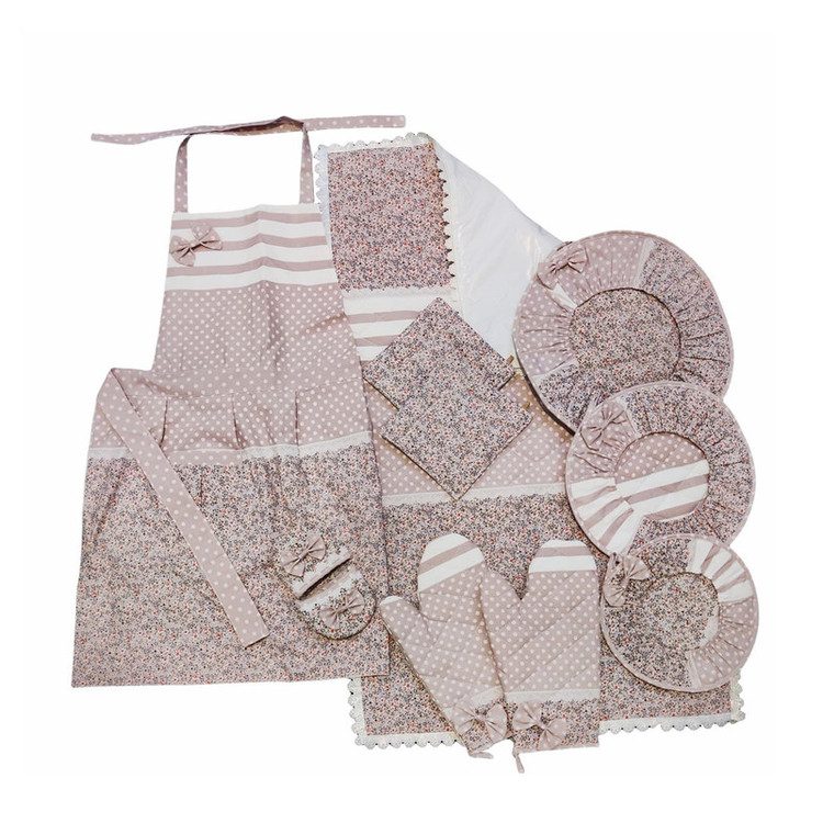 شاملسه عدد دمکنی , یک جفت دستکش فر , یک عدد پیشبند , آبگیر کنار سینک , دو عدد دستگیره قابلمه , دو عدد دستگیره