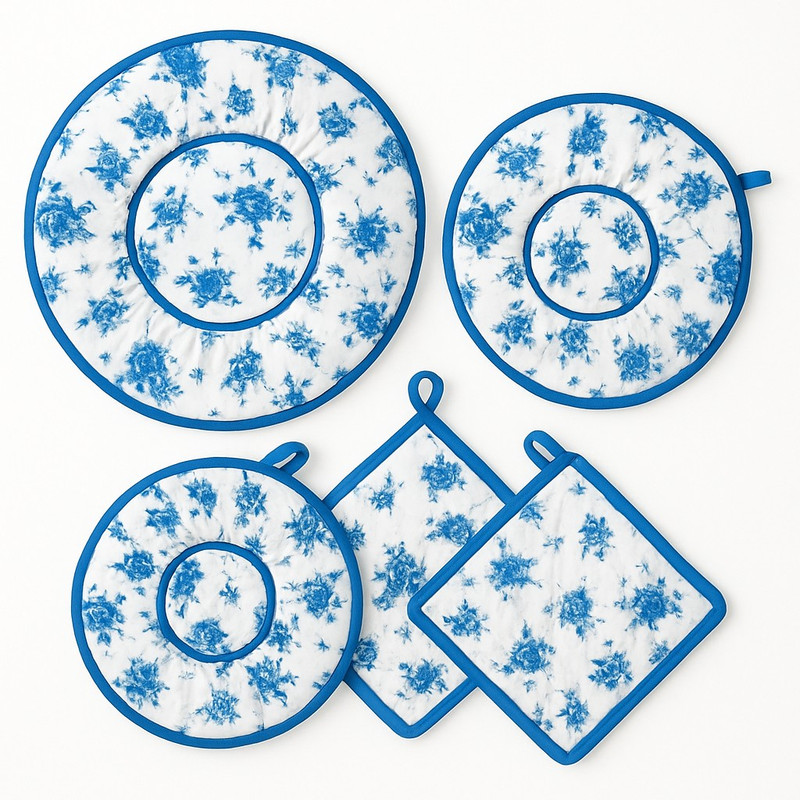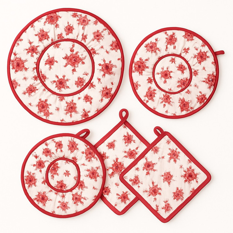 ست دمکنی پنج تکه گلدار حاوی سه عدد دمکنی با سایز های 27 ، 29 ، 34 و همچنین دو عدد دستگیره با سایز 20 سانت میباشد ، پارچه استفاده شده از مرغوبت ترین پارچه ها میباشد همچنین داخل دمکنی و دستگیره ها از ابر نرم استفاده گردیده شده است .