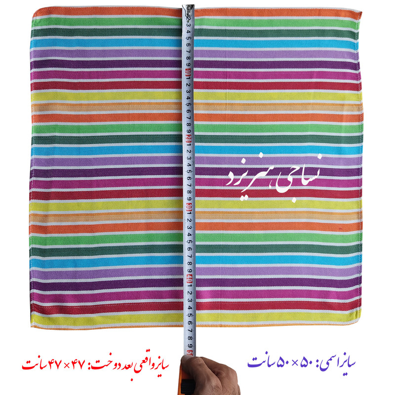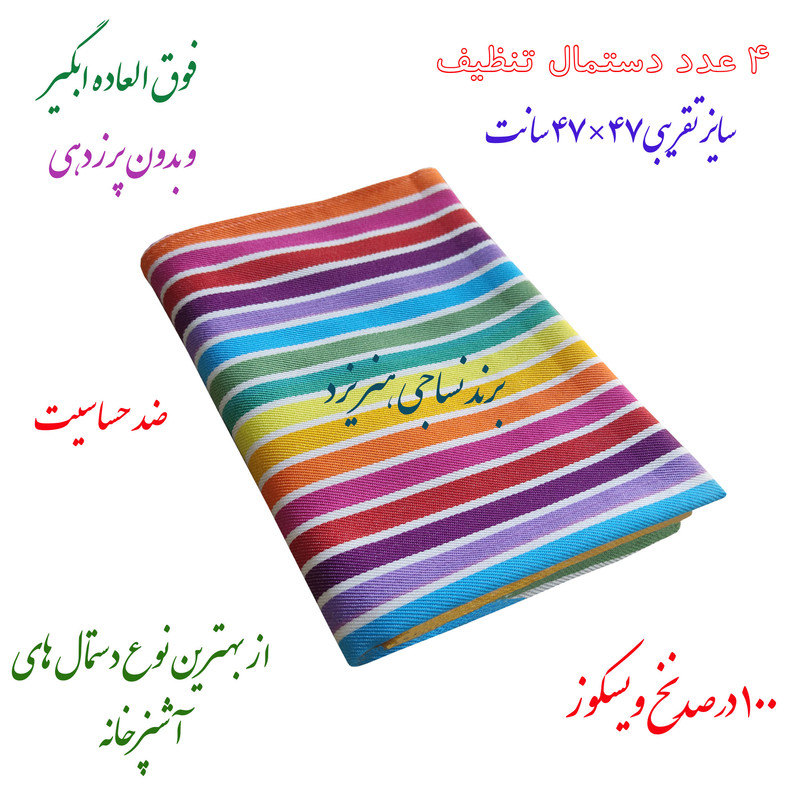 دستمال تنظیف برند نساجی دُر هنر یزد مدل rainbow تولید شده از 100 صد نخ ویسکوز که بدون پرزدهی و با آبگیری فوق العاده و بالاتر از تصور، جای خود را در تمام منازل باز کرده است. این محصول یزدی، رنگ ری اکتیو ثابتی دارد و علاوه بر نرمی و لطافت و ضد حساسیت بودن، رنگ های شاد و جذاب آن، آن را به یک دستمال تنظیف و حتی حوله جیبی کم نظیر تبدیل کرده است. بسته بندی این محصول دارای 4 عدد دستمال با سایز کاربردی دوردوزی شده با اندازه اسمی 50×50 سانت و اندازه واقعی با مقداری تلرانس تولید حدود 47×47 سانت است.