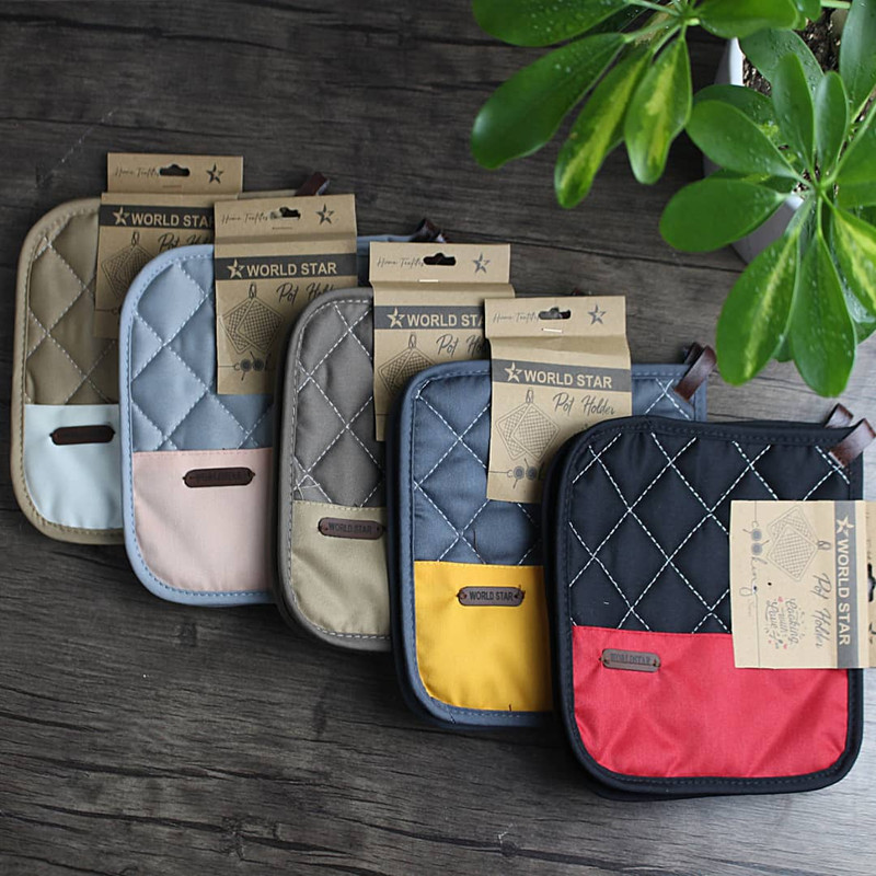 دستگیره آشپزخانه با جنس کتان کج راه با جنس و کیفیت عالی در رنگ بندی های ترکیبی و بسیار زیبا به شکل مربع در ابعاد 19x19 با الیاف طبیعی و مناسب برای تزیین آشپزخانه