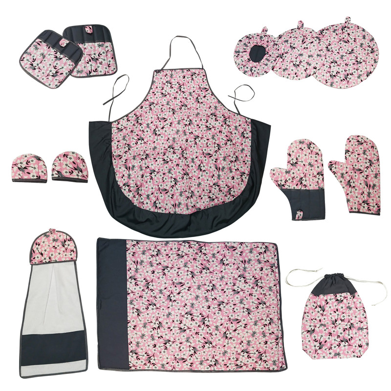این سرویس شامل 3عدد دمکنی،2عدد دستکش فر،2عدد دستگیره مربع،2عدد دستگیره چدنی،1عدد پیشبند،1عدد کیسه سبزی،1عدد نمگیر،1عدد حوله آشپزخانه میباشد که با ترکیب هنرمندانه 2پارچه ساده و طرح دار این سرویس جذاب تر شده است.