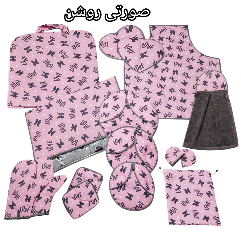 سرویس ۱۶ پارچه طرح رها با دوختی مرتب و دقیق با اقلامی کاربردی و ضروری طراحی و تولید شده است.شامل ۲عدد دستگیره' مربع ۲عدد دستگیره قلبی' ۲عدد دستگیره تاوه '۲عدد دستکش فر '۱عدد حوله با کیفیت '۱عدد پیشبند ۲لایه ضد آب' ۳عدد دمکنی' ۱عدد نمگیر ظروف ۳لایه' ۱عدد کیسه نان ۳لایه' ۱عدد کیسه سبزی ۳لایه میباشد.