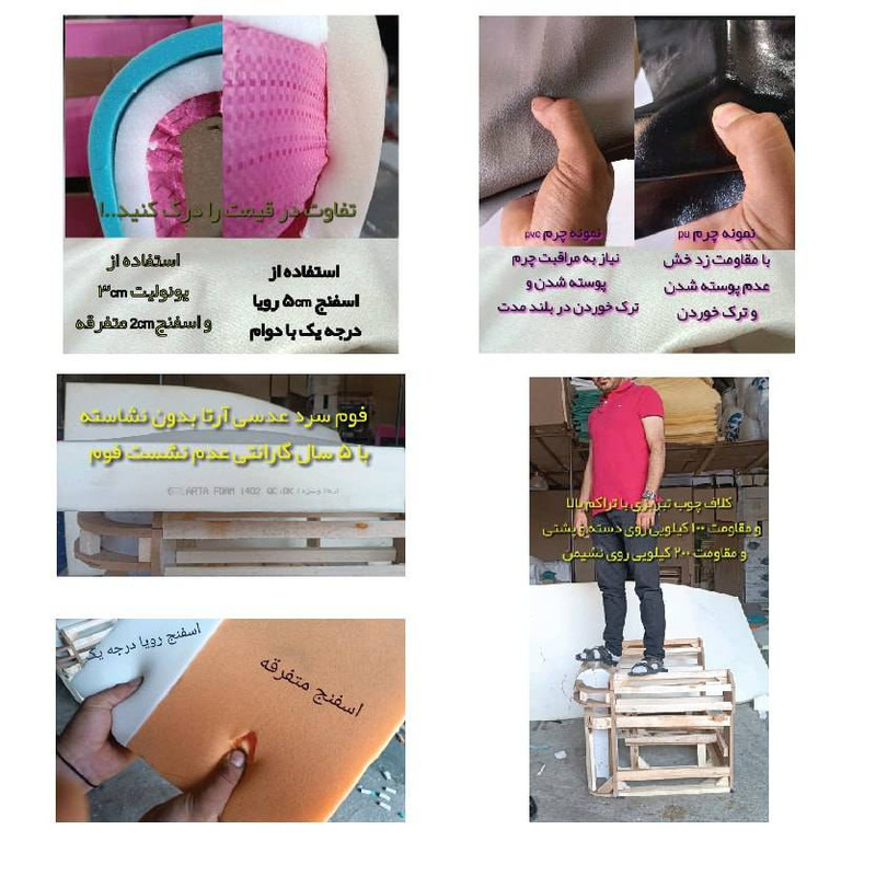 استفاده از تسمه کشی های ترک ۵ خط با تراکم ۱۰۰۰ شانه برای انعطاف نشیمن استفاده از اسفنج 30 کیلویی ویژه دسته و پشتی و فوم سرد شرکتی برای نشیمن با ماندگاری ۵ ساله و عدم نشست اسفنج و فوم و بدون پودر شدن در طول زمان ، استفاده از چرم pu : دارای مقاومت در برابر حرارت سیگار و کبریت و فندک تا ۵ ثانیه عدم ترک خوردگی در سرد و گرم شدن مبل در طول زمان ، عدم ساییدگی و پوسته شدن در هنگام نشست و برخواست روی مبل ، مقاوم در برابر ناخن کشیدن کودکان روکش چرم این محصول براق بوده (و امکان سفارش با چرم مات و پارچه مخمل نیز وجود دارد.)