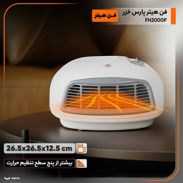 فن هیتر «پارس خزر» مدل «FH2000P» دستگاهی کوچک و کاربردی است که توسط این شرکت معتبر عرضه شده است. این محصول بدنهی پلاستیکی باکیفیتی دارد و قابلیت فعالیت بهعنوان فن را نیز دارد و در هوای گرم میتواند بهعنوان پنکه از آن استفاده کرد. ابعاد کوچک FH2000P امکان استفاده از آن روی میز را به کاربر میدهد. فن هیتر پارس خزر مدل FH2000P در روزهای سرد بهعنوان بخاری برقی به کار میآید. کافی است پیچ تنظیم دما چرخانده شود تا المنت حرارتی دستگاه روشن شود. همزمان فن دستگاه، هوای داغ را به بیرون دستگاه هدایت میکند. پیچ تنظیم دما که درواقع یک ترموستات است هم در این دستگاه در نظر گرفته شده است. یکی از آپشنهای این فن هیتر ممانعت از یخزدگی المنتهای آن است. این دستگاه مجهز به عملکرد قطع حرارتی خودکار است و در صورت افزایش درجه حرارت دستگاه به هر دلیل (مانند بستهشدن شبکهی ورود هوا یا سقوط دستگاه) بهصورت خودکار جریان برق قطع میشود و فن و المنتها خاموش میشوند. این دستگاه مناسب کسانی است که در ادارات یا شرکتها ترجیح میدهند در روزهای سرد زمستانی، از هوای گرم تولیدشده توسط بخاری لذت ببرند و درعینحال در روزهای گرم از قابلیت پنکه دستگاه استفاده کنند. امکان بهرهمندی از قابلیتهای فن هیتر پارس خزر در مغازهها، ادارات، موسسهها و حتی برای مصارف شخصی مثل اتاقخواب یا اتاق نشیمن باعث شده که این محصول یکی از دستگاههای محبوب ارائهشده در بازار باشد. پارس خزر از دیرباز به ارائهی محصولات باکیفیت و کارآمد در بازار لوازمخانگی برقی شناخته شده است. کارآمدی محصولات این تولید و عرضهکننده به همراه خدمات پس از فروش آن، باعث شده که محصولات این شرکت از پرفروشترینها و محبوبترینهای بازار به حساب آید.