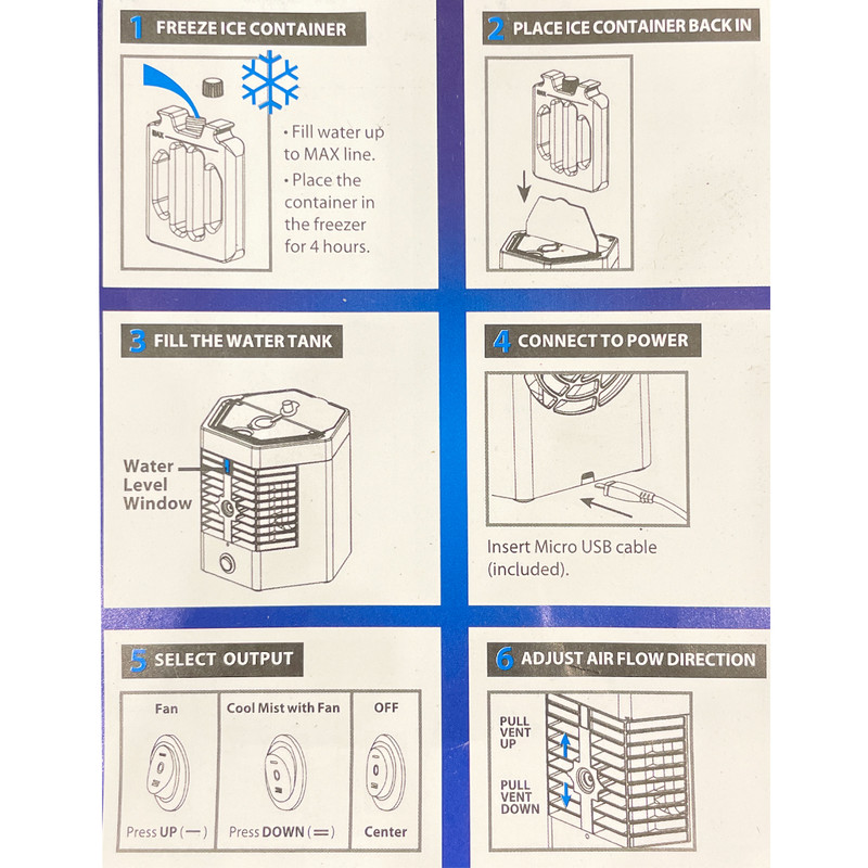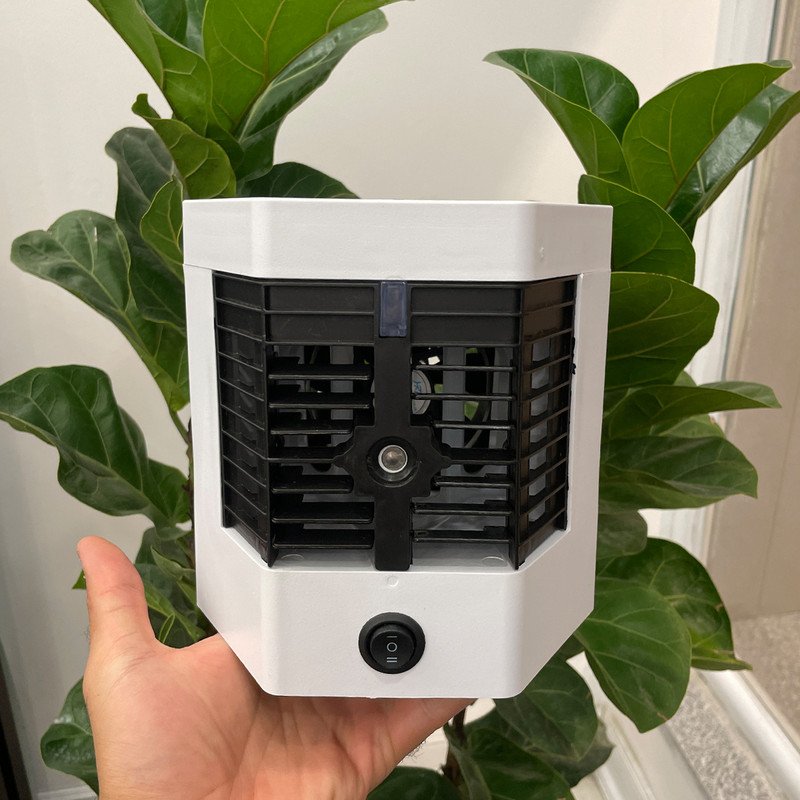 در حال حاضر که صرفه جویی در مصرف آب و برق بسیار مهم میباشد ، کولر آبی رومیزی میتواند یکی از راههای مناسب جهت از بین بردن گرما با مصرف کمترین میزان آب و برق باشد ، برق این کولر بوسیله پورت USB تامین میگردد و قابلیت اتصال به پاور بانک نیز دارد. در کناراین کولر زیبا مخزن یخ کوچکی قراردارد که با پرکردن آن امکان استفاده از کولر به میزان تقریبی 8 ساعت وجود دارد. این کولر آبی دارای کلید تنظیم سرعت در سه حالت کم ، متوسط و زیاد میباشد. وجود چراغ LED در مخزن کولر که دارای 7 رنگ متفاوت میباشد زیبایی خاصی به این کولر رومیزی داده است . ابعاد کوچک این کولر باعث گردیده است که امکان استفاده از آن برروی میز کار وجود داشته و بهترین گزینه بعنوان یک خنک کننده رومیزی باشد.یک کابل تغذیه USB نیز در مخزن یخ کولر قراردارد .دستگاه قابلیت تنظیم جهت پخش باد دارد از این نظر برای استفاده روی میز کار، چادرهای کوچک و فضاهای محدود بسیار مناسب است