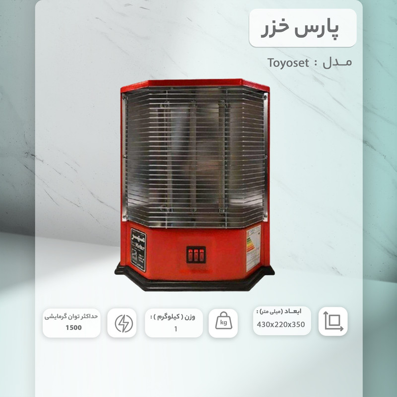 بخاری برقی ایستاده مهر MEHR مدل تویوست Toyoset با حداکثر توان 1500 وات به شکل کلاسیک و ساده با رده انرژی A و مصرف کم انرژی همراه با بازده حرارتی بالا طراحی شده است تا محیطی گرم و مطبوع را در فصول سرد سال برای شما ایجاد کند. این دستگاه دارای 3 المنت سرامیکی یا سیم پیچ فلزی است که با داغ و سرخ شدن سیم پیچ ها تولید حرارت می کند و به دلیل نداشتن شعله حتی در مکان هایی با تهویه نامناسب نیز می توان بدون کاهش میزان اکسیژن گرمای مطلوب و مناسب را ایجاد نمود. بخاری ایستاده تویوست مهر دارای پنل با سه کلید کنترلی و چراغ نشانگر داخلی روی بدنه دستگاه می باشد که جهت روشن و خاموش کردن المنت های بالا، پایین و وسط بطور مجزا کاربرد دارد. صفحه فلزی به کار رفته بعنوان منعکس کننده نور و حرارت در پس زمینه المنت ها موجب کارایی و بازده حرارتی بیشتر دستگاه گردیده و فضای وسیع تری را گرم می کند. این بخاری برقی مجهز به کلید ایمنی قطع کن اتوماتیک است که زیر بدنه دستگاه تعبیه شده تا در صورت واژگون شدن احتمالی وسیله بطور خودکار آن را خاموش کرده و از بروز خطر آتش سوزی جلوگیری گردد.