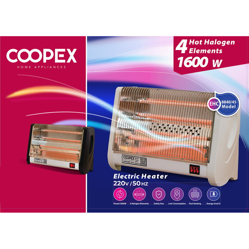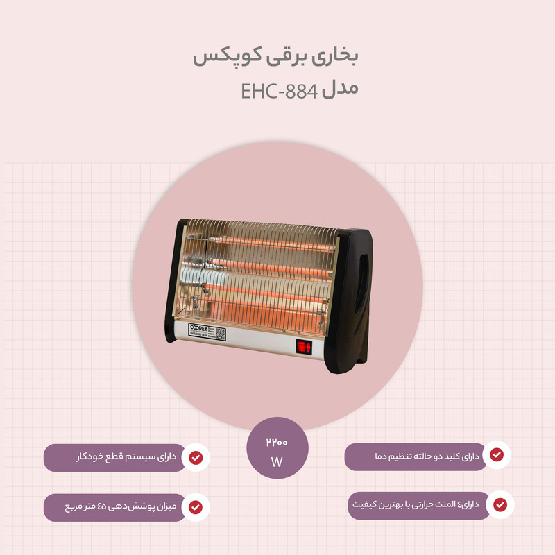 یکی از بهترین برندهای تولیدکننده بخاریبرقی در ایران لوازمخانگی کوپکس است که در سالهای اخیر مورد استقبال بسیاری از مصرفکنندگان قرار گرفته و علاوه بر توزیع داخلی محصولات خود را به کشورهای آسیایی و اروپایی نیز صادر میکنند. این شرکت تولیدی در بدنه بخاریهای برقی از موارد درجهیک پلاستیکی ABS نو استفاده ممیکند که در صورت قرار گرفتن در برابر هرگونه حرارت مقاوم هستند و دمای مقاومت آن تا 250 درجه سانتیگراد تحمل دما دارد. گرید انرژی بخاریبرقی کوپکس مدل EC-8840 بالاترین گرید انرژی یعنی A است که نشانگر کمترین هدر رفت انرژی است. بخاریبرقی کوپکس دارای دو کلید تنظیم دما است که در حالت اول 2 المنت روشن شده و در حالت دوم 4 المنت روشن میشود و بیشترین حرارت را ایجاد مینماید. همینطور زیر این دستگاه بخاریبرقی یک کلید ایمنی تعبیهشده که در صورت افتادن دستگاه یا وارونه شدن، دستگاه را خاموش میکند. پرههای فلزی جلوی بخاریبرقی کوپکس دارای فاصله استاندارد و تراکم بالا هستند که باعث میشود بههیچعنوان انگشت کودکان و یا حیوانات به المنتها نزدیک نشود و بهترین حالت ایمنی را فراهم آورد.