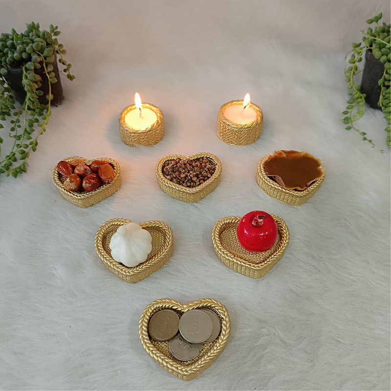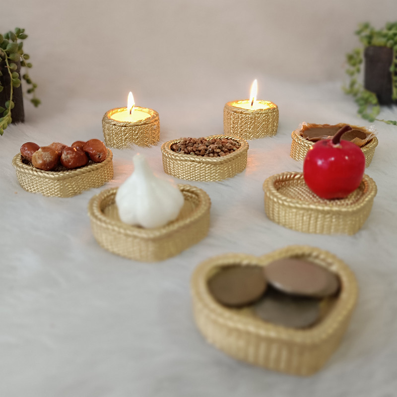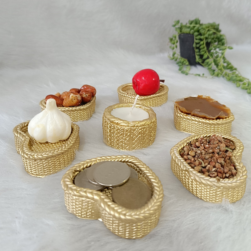 مجموعه ظروف هفت سین مدل قلب حصیری که شامل 6 عدد ظرف هفت سین طرح قلب و دو عدد جاشمعی زیبا میباشد.جا شمعی ها با پارافین مرغوب پر شده اند و پس از استفاده میتوانید دوباره داخل آنها پارافین ریخته و یا به راحتی از شمع وارمر استفاده کنید.رنگ این محصولات تک رنگ است یعنی هر رنگی که انتخاب میکنید تمام 8 عدد ظرف ارسالی به همان رنگ ارسال میشود و رنگ پارافین داخل جاشمعی ها در همه موارد فقط سفید است.