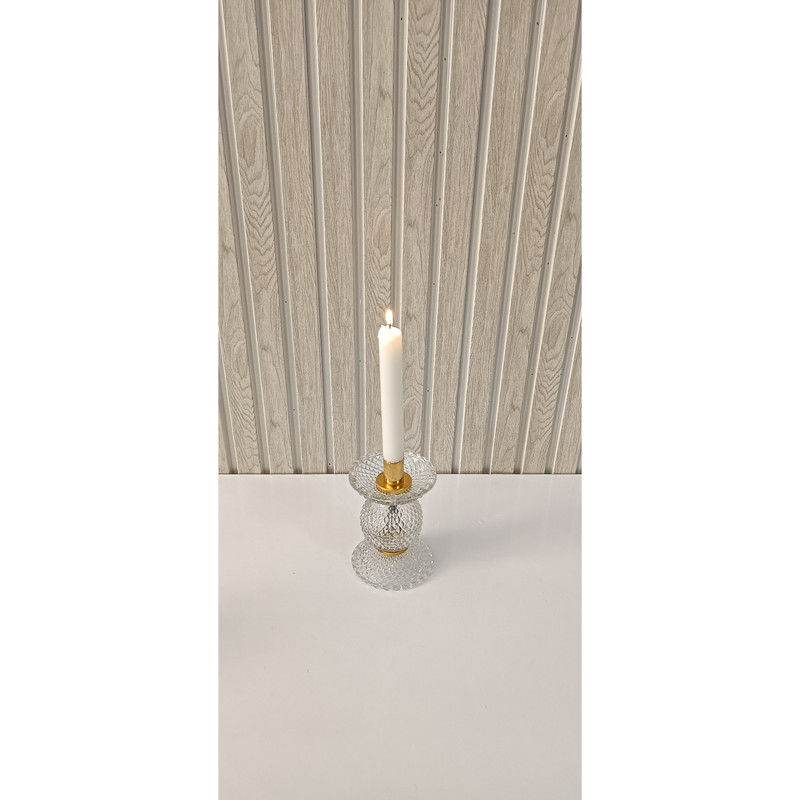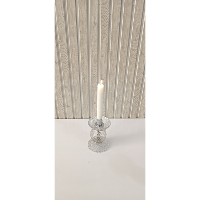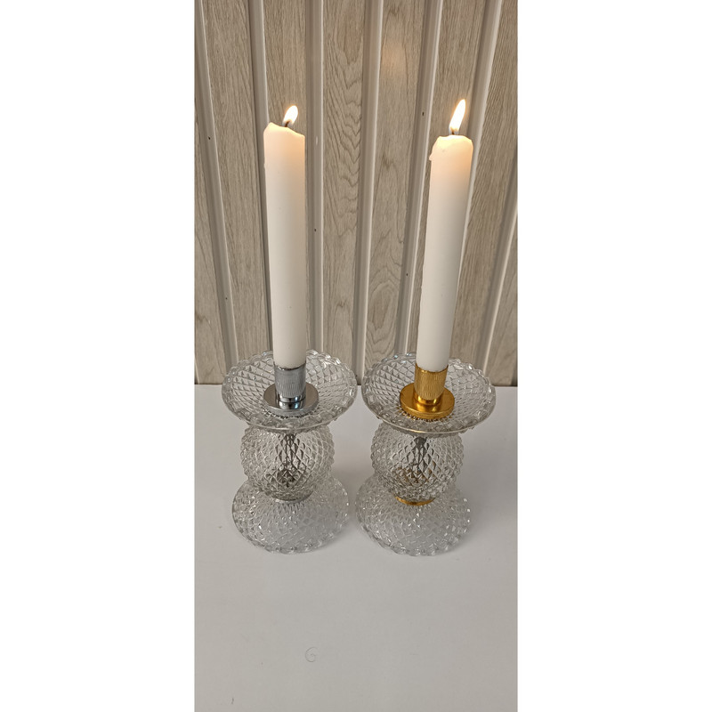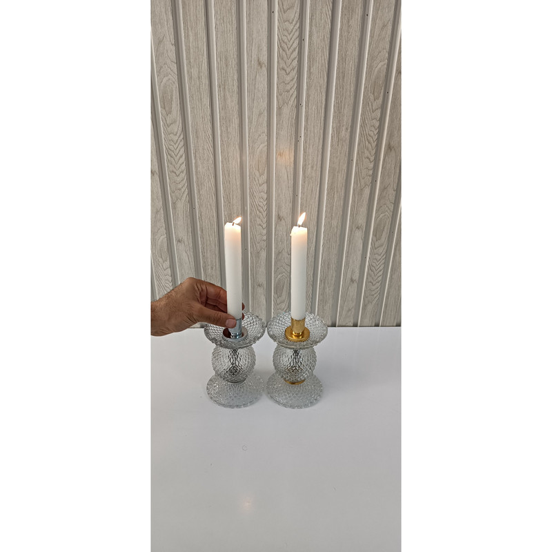 شمعدان مورد انتخاب شما از جنس شیشه میباشد. تمامی قیمت های آن از شیشه ای است به غیر سر جاشمعی که از جنس فلز آبکاری شده است. وسط این جا شمعی به شکل گوی است و برای تسهیل استفاده از آن یک کفی از جنس شیشه رو آن قرار گرفته است.