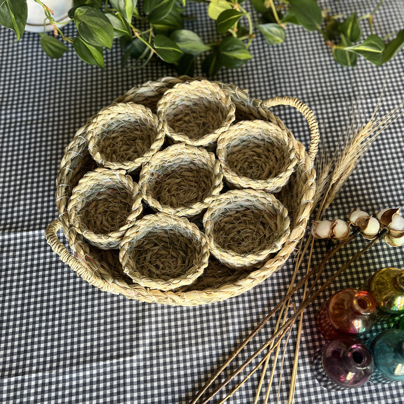 هفت سین مدل دسته دار طرح 7 خانه کاملا دستباف بوده و با عشق تولید شده است. این محصول دارای هفت عدد پیاله و یک عدد سینی با قطر 32 سانتیمتر میباشد. پیاله ها با قطر دهانه 10 سانتیمتر هستند. از این محصول میتوانید به عنوان هفت سین، اردوخوری، ظرف پذیرایی آجیل و خشکبار، سبد مزه خوری و بسیاری موارد دیگر استفاده کنید.