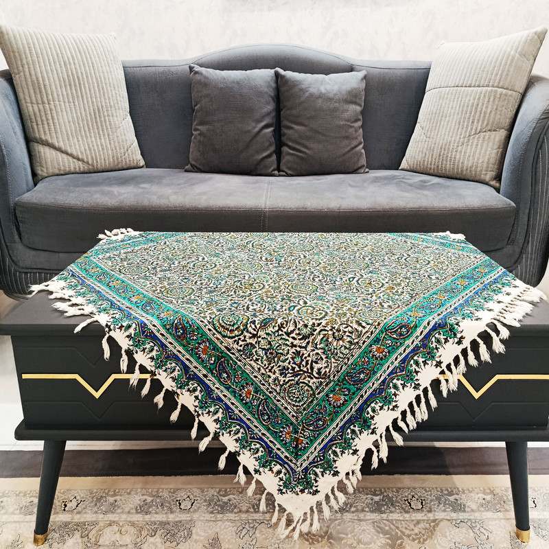 سفرهٔ قلمکاری مدل گل اناری در تصویر، اثری زیبا از هنر اصیل ایرانی است که با طرحهای ریزنقش اسلیمی و ختایی درهمتنیده شده و جلوهای چشمنواز پدید آورده است. زمینهٔ روشن پارچه، بستری مناسب برای نمایش نقشهای گل اناری، برگها و نقوش پیچکی به رنگهای فیروزهای، لاجوردی، سبز و قهوهای فراهم کرده و ترکیب این رنگها هویتی سنتی و در عینحال آرامبخش به محصول داده است. حاشیههای چندلایه با طراحی منظم و هماهنگ، قاب زیبایی برای متن سفره ساختهاند و ریشههای اطراف، حس دستی و اصالت بیشتری به آن میبخشند. این سفره انتخابی ایدهآل برای سفرهآرایی سنتی، استفاده در مهمانیها، یا حتی دکوراسیون منزل است و بهراحتی میتواند فضای هر محیطی را گرمتر و ایرانیتر جلوه دهد.