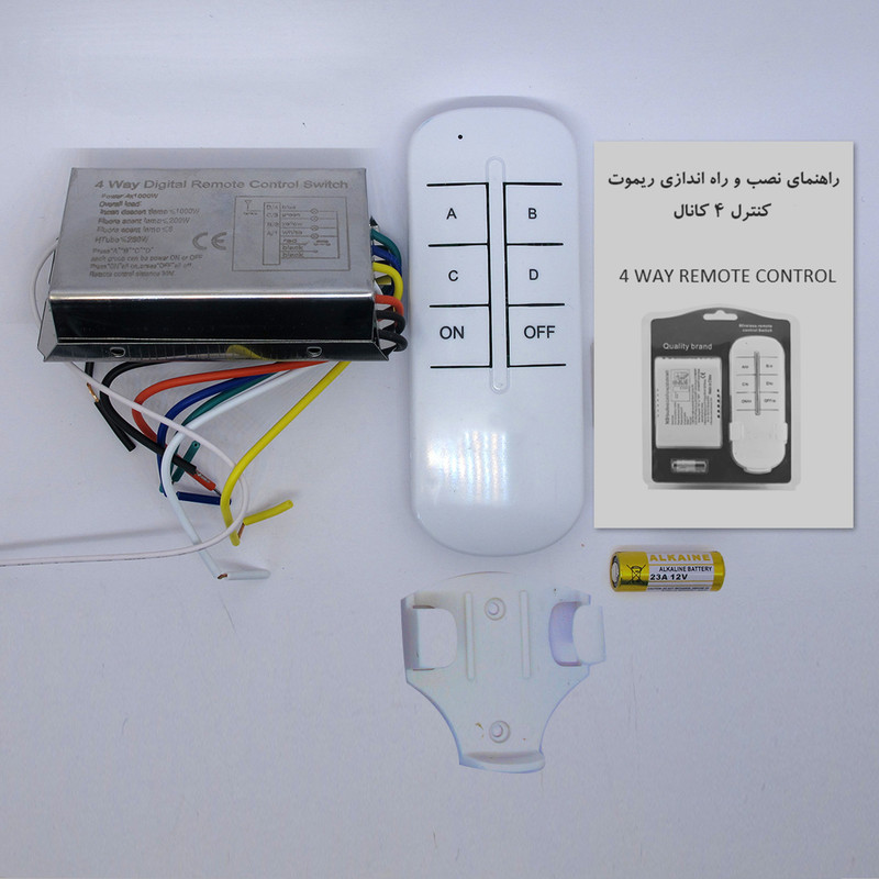 این محصول یک کنترل 4 کاناله بدون نیاز به آداپتور است که به وسیلۀ آن و بدون نیاز به هیچگونه وسایل اضافی قادره خواهید بود لوستر خود را ریموتی کنید(با 4 مدل نوری مختلف) و یا 4 دستگاه یا روشنایی مختلف را توسط ریموت (حتی از فاصلۀ 30 متری) خاموش یا روشن کنید. این ریموت پیش تر تنها در برخی لوسترهای خارجی مورد استفاده قرار میگرفت اما هم اکنون قادر هستید با تهیۀ آن به صورت جداگانه، ریموت را نه تنها در لوستر، بلکه در هر دستگاه یا منبع نوری دیگری نیز استفاده کنید. یکی از مشکلات عموم در نصب و راه اندازی این گونه ریموت ها، عدم اطلاع از چگونگی نصب آن بود که در محصولی که پیش رو دارید، یک برگه راهنمای نصب فارسی قرار داده شده تا هر شخصی بتواند به راحتی آن را نصب کند. محتویات داخل جعبه شامل رسیور اصلی، ریموت، هولدر ریموت، باطری و برگۀ راهنمای نصب است. این ریموت قادر است در مجموع تا 1000 وات را پشتیبانی کند.