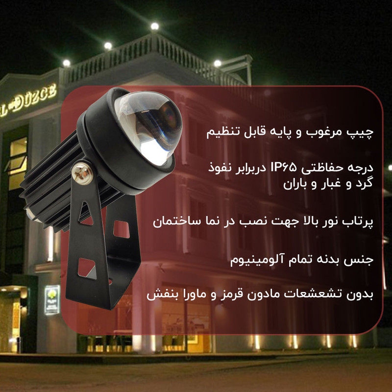 چراغ جت لایت یکی از انواع چراغهایی است که شما میتوانید از آن برای نورپردازی خارجی ساختمان خود استفاده کنید. با کمک چراغ جت این امکان را دارید تا یک نور خطی بسیار قوی روی نمای ساختمان ایجاد کنید. این جت لایت دارای بدنه تمام فلزی با پوشش رنگ مقاوم می باشد که وظیفه ی دفع حرارت رو به بهترین نحو ممکن انجام می دهد، همچنین به دلیل برخورداری از درجه حفاظتی IP65 دربرابر نفوذ گرد و غبار و باران مقاومت مناسبی دارد. چراغ جت لایت 5 وات پرشین لایت دارای چیپ لامپ cob می باشد که از بهترین برند های لامپ LED و با دوام ترین نوع آن می باشد. این محصول از بهترین متریال تولید شده است و از پرتاب نور زیاد و طول عمر بالا برخوردار می باشد. چراغ جت لایت نور را به صورت خطی منعکس میکند؛ از این رو میتوانید با کمک آن نورپردازی بسیار زیبا و دقیقی روی نمای ساختمان ایجاد کنید. چراغ جت لایت به صورت روکار نصب میشود و معمولا در نورپردازی ساختمانها، آن را در بالا یا پایین ستونهای ساختمان نصب میکنند.