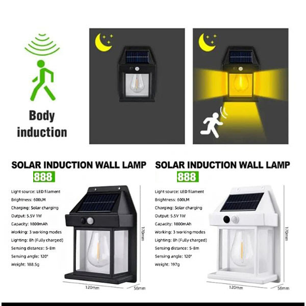چراغ خورشیدی دیوارکوب مدل 888 برای نصب روی دیوار باغ و یا سردر ساختمان ها و مجتمع های مسکونی و یا هر مکان دیگری که در طول روز امکان تابش نورخورشید وجود داشته باشد مناسب است. هنگام استفاده از آن برای اولین بار، محصول را به مدت چند ساعت در مکانی آفتابی قرار دهید تا شارژ شود. هنگامی که از محصول برای مدت طولانی استفاده نمی کنید آن را در مکانی آفتابی قرار دهیدتا به مدت یک روز شارژ شود.زمان شارژ و کارایی پنل های خورشیدی ممکن است تحت تاثیر آب و هوا و محل قرارگیری محصول متفاوت باشد. این محصول قابل استفاده در حیاط، مغازه، باغ ، کمپینگ و مناطق خارج از شهر و قابل نصب روی هر دیوار مخصوصا شرایطی که دسترسی به برق شهر ندارید و میخواهید با نور خورشید روشنایی را تامین کنید. از مزیت های خوب این محصول این است که نیاز به برق و سیم کشی ندارد و تنها باید آن را نصب کرد و کلید آن را زد. همچنین دیگر مزیت آن سنسور شناسایی حرکت است که با حرکت هر چیزی روبروی آن باعث روشن شدن آن میشود . و نور آن آفتابی بوده و خود چراغ بصورت لامپ میباشد. اگر دنبال محصولی برای روشنایی حیاط یا باغ خود هستید و حوصله دردسرها و هزینه سیم کشی را ندارید چراغ دیوارکوب خورشیدی گزینه فوق العاده با صرفه ای برای شماست. همچنین با ارتفاع دو تا 3 متر باید زاویه و جهت نور خورشید در موقعیت مطلوب تنظیم شود. مدت زمان شارژ دهی 8 ساعت و دارای سه حالت روشنایی(دو حالت با سنسور حرکتی و یک حالت روشنایی دائم) است . دستگاه از یک پنل خورشیدی با ابعاد 7 در 5 سانتیمتر برای شارژ باتری لیتیوم یون داخل دستگاه بهره می برد و به هنگام شب با عبور افراد از نزدیکی آن به طور خودکار روشن شده و با سپری شدن مدت زمان کوتاه و با نبود و عدم حضور فرد در مقابل آن خاموش می شود . نور آن آفتابی بوده و خود چراغ بصورت لامپ میباشد. بدیهی است که دستگاه را می توان در فضای باز و در معرض بارش باران نصب کرد .