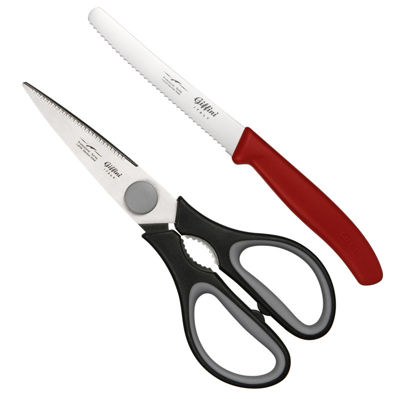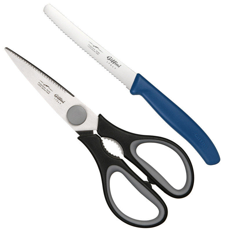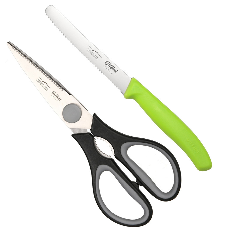 این چاقو جزو تیزترین چاقوها شناخته میشود که توسط GIFFINI ایتالیا ارایه شده و بسیار کابردی میباشد و بعنوان یک چاقوی همه کاره در آشپزخانه به شما کمک خواهد کرد که از کارکردن با این چاقو و آشپزی لذت ببرید.و قیچی آشپزخانه همراه ان کمک فراوانی در آشپزی راحت به شما خواهد کرد.