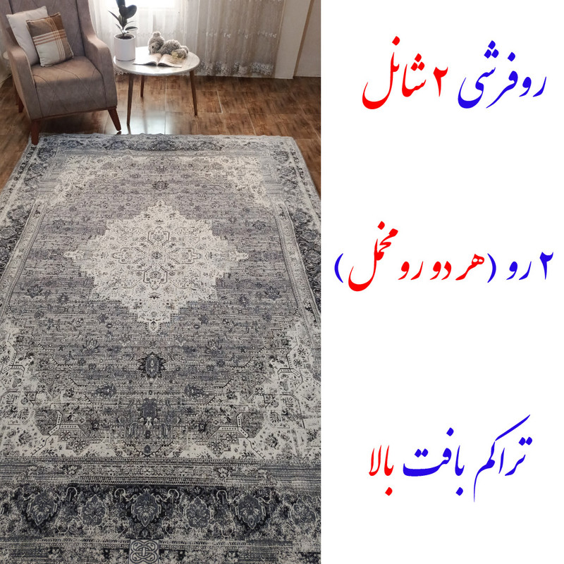 روفرشی دو شانل 2 رو مخمل 2 رو از برند معتبر و لاکچری گلباف یزد با نهایت کیفیت و با استفاده از گران ترین و با کیفیت ترین نخ و رنگرزی موجود در بازار جدیدا طراحی و تولید شده است. طرح پتینه بسیار جذاب و شیک، رنگ و روی منزل تان را دگرگون می کند. این روفرشی 2 رو، نرم و لطیف بوده و لذتی متفاوت از یک روفرشی را در ذهن شما ایجاد می کند که با تصورات قبلی شما از یک روفرشی متفاوت خواهد بود. تراکم بافت بالا سبب شده حرکت این روفرشی نسبت به روفرشی های دیگر کمتر باشد. این روفرشی در سایز های 1.5 (100×150 سانت) و 3 (150×200 سانت) و 6 (200×300 سانت) و 9 (250×350) و 12 متری (300*×400 سانتیمتر) با مقداری تلرانس تولید، بافت می شود. رنگ های زمینه پشت و روی این روفرشی متفاوت است که در تصاویر عکس پشت و رو قابل مشاهده است. زیبایی ناب و کیفیت درجه یک شعار شرکت گلباف یزد است که توسط این تولید کننده زبردست و با تجربه در تمام تولیداتش به رخ کشیده میشود.
