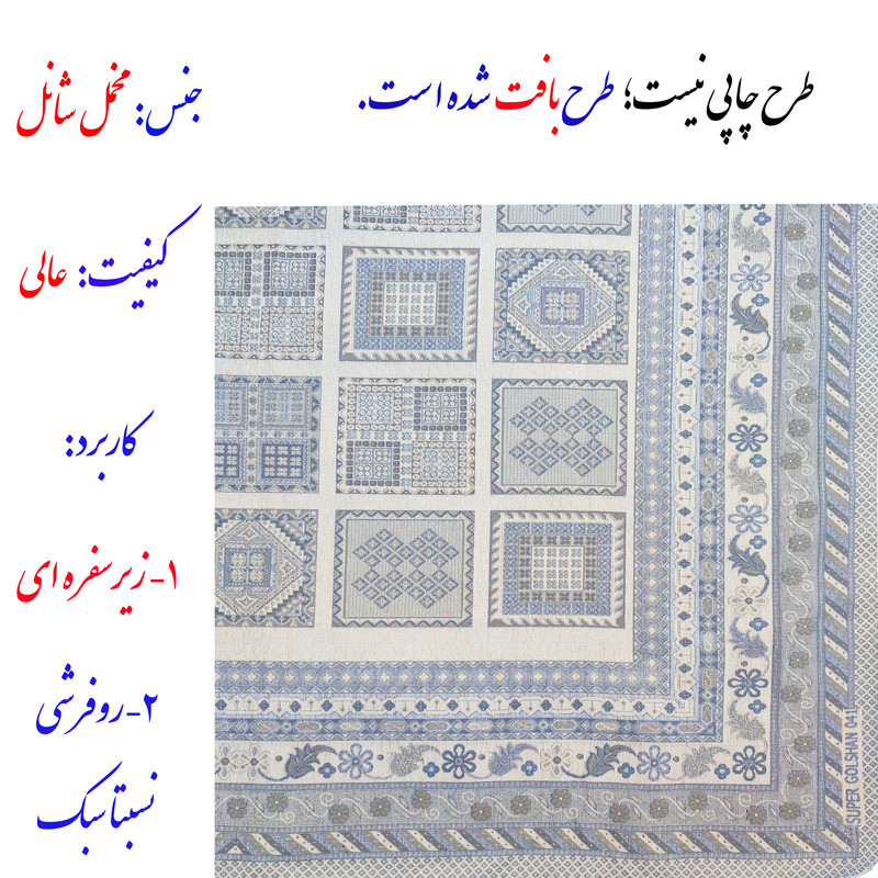 سایر توضیحات: زیرسفره مخمل شانل طرح خشتی فوق العاده زیبا از شرکت سوپر گلشن یزد با کیفیت فوق العاده و بافت عالی که می توان به عنوان روفرشی 2 رو استفاده کرد.