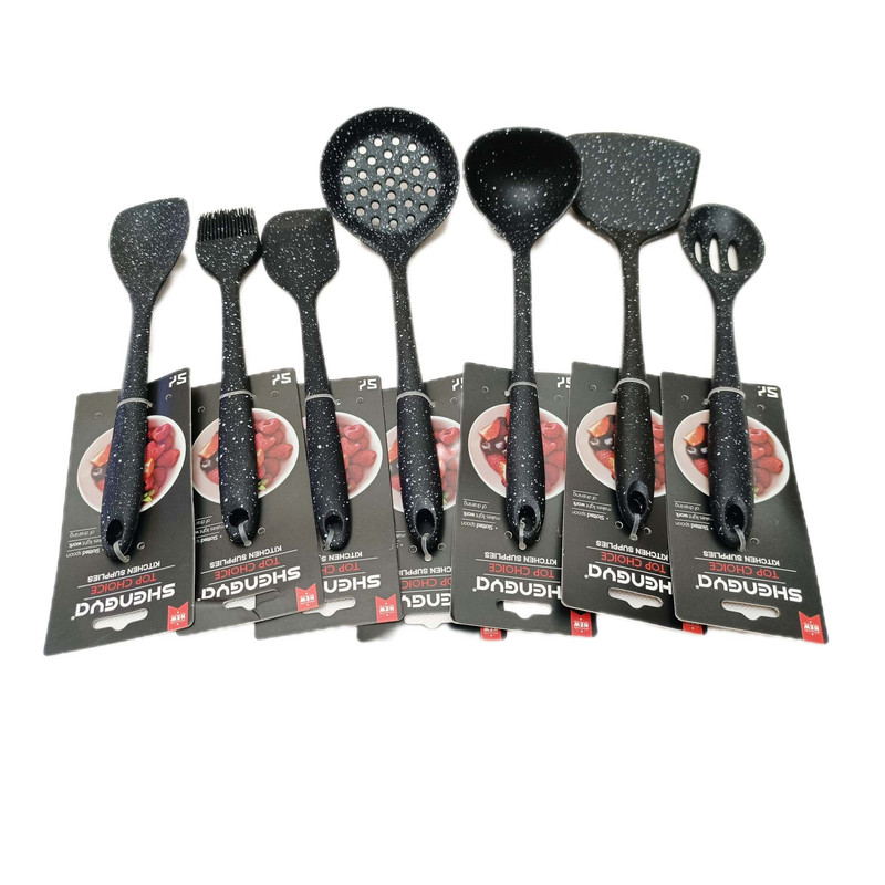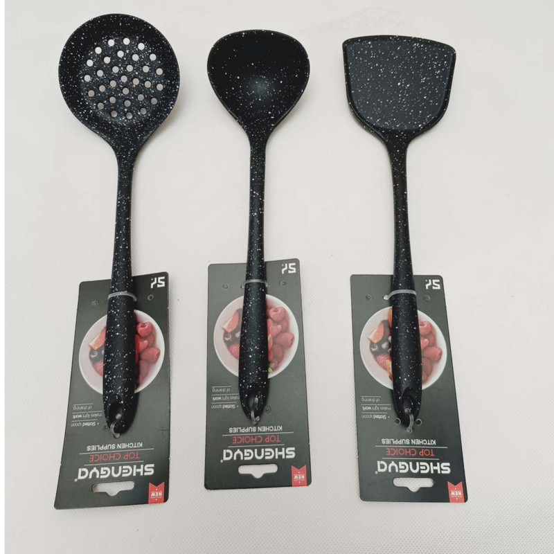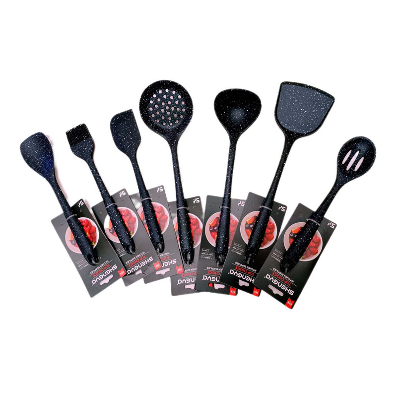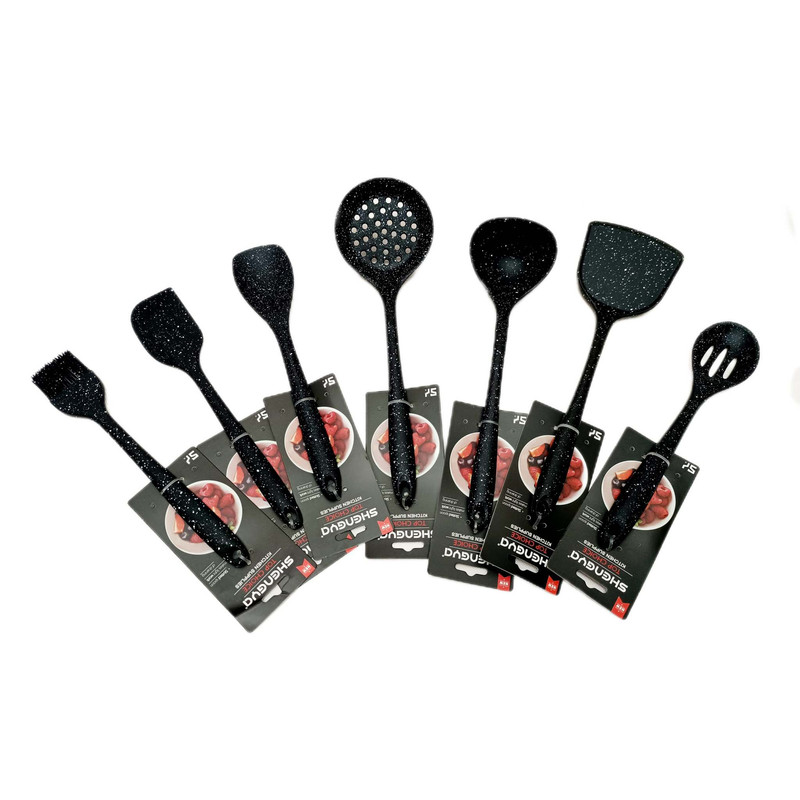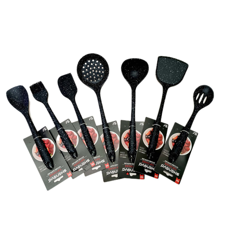 سایر توضیحات : وارداتی شامل دو کفگیر ارتفاع 32 و طول 10 و ملاقه32 و 9 لیسک و فرچه27و6 قاشق شیار دار و لیسک قاشقی 27و6