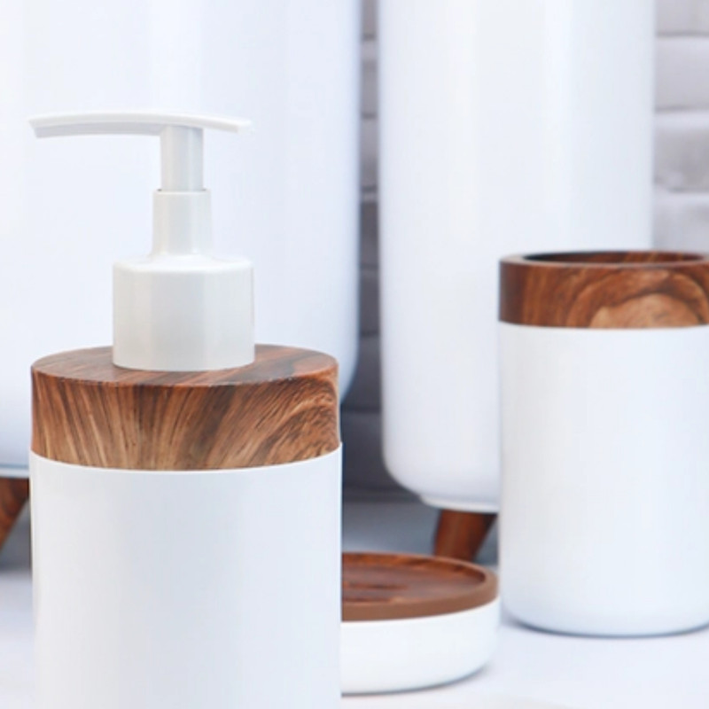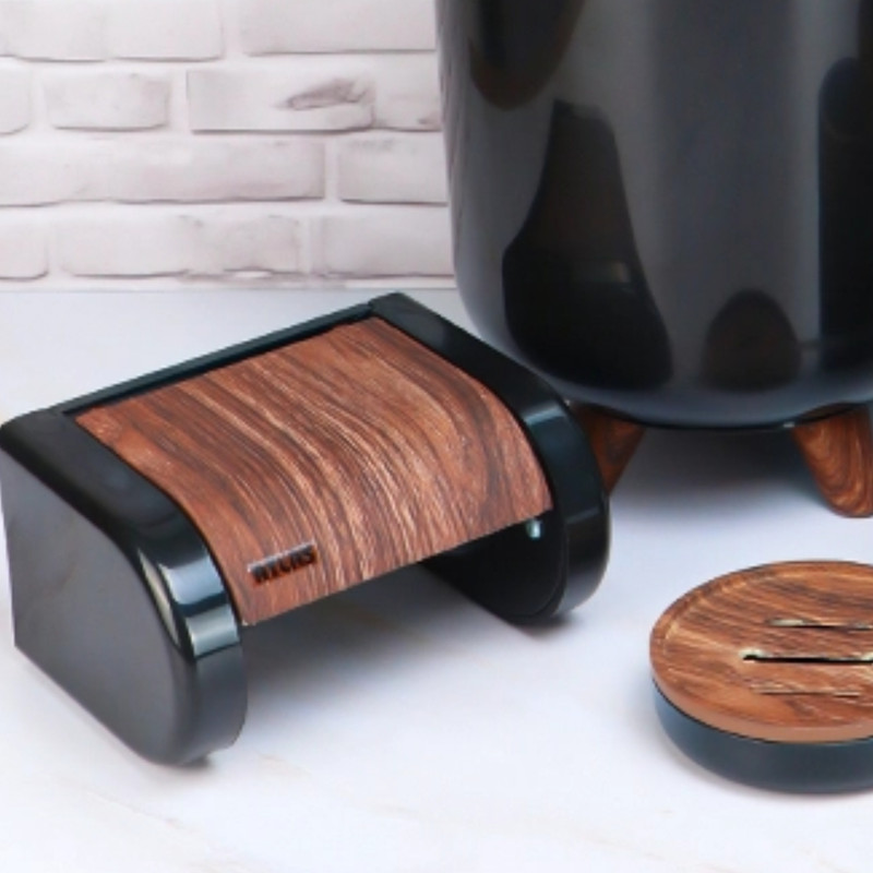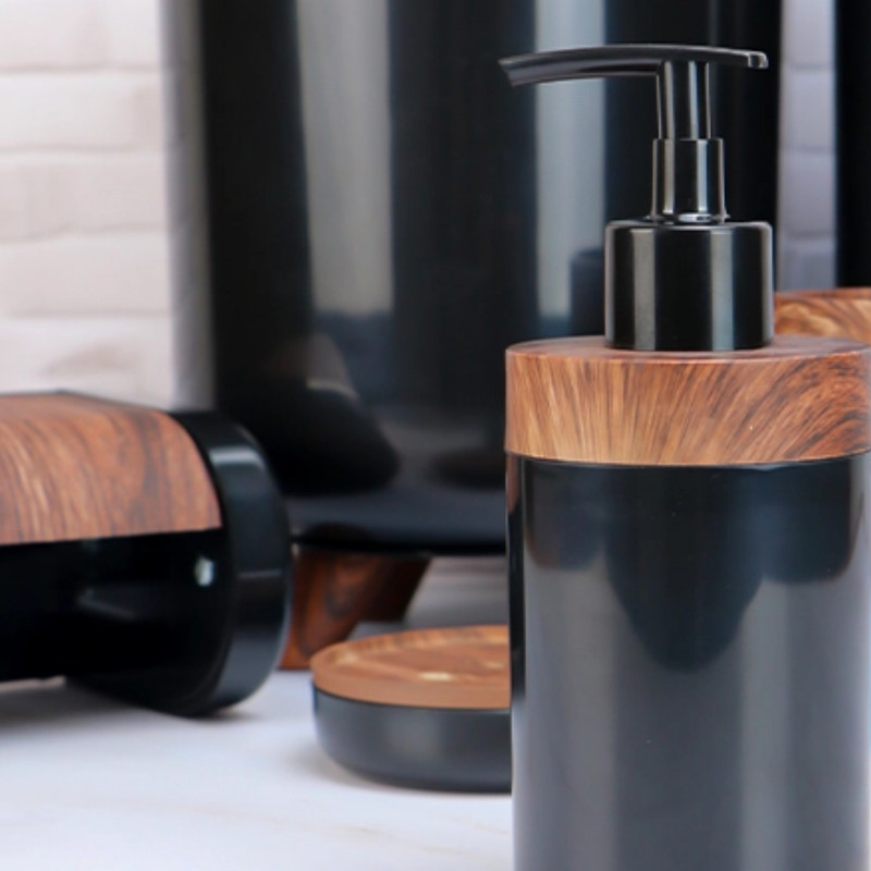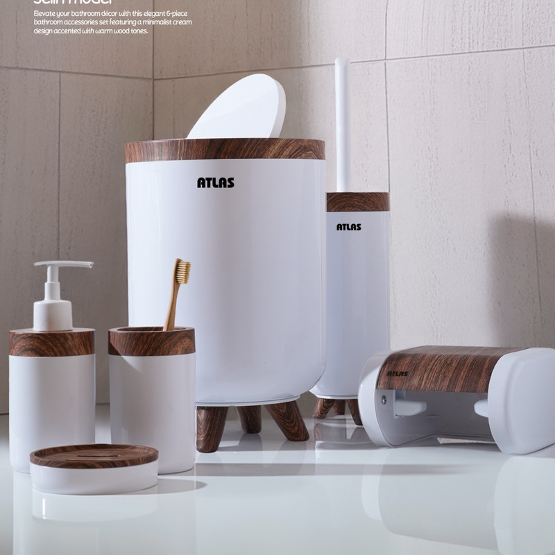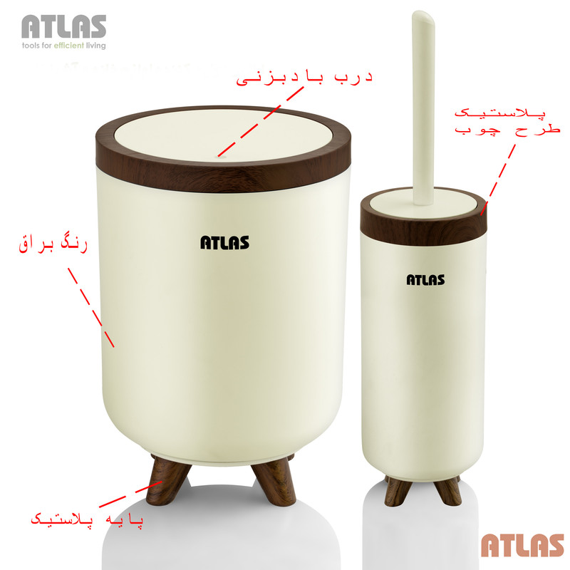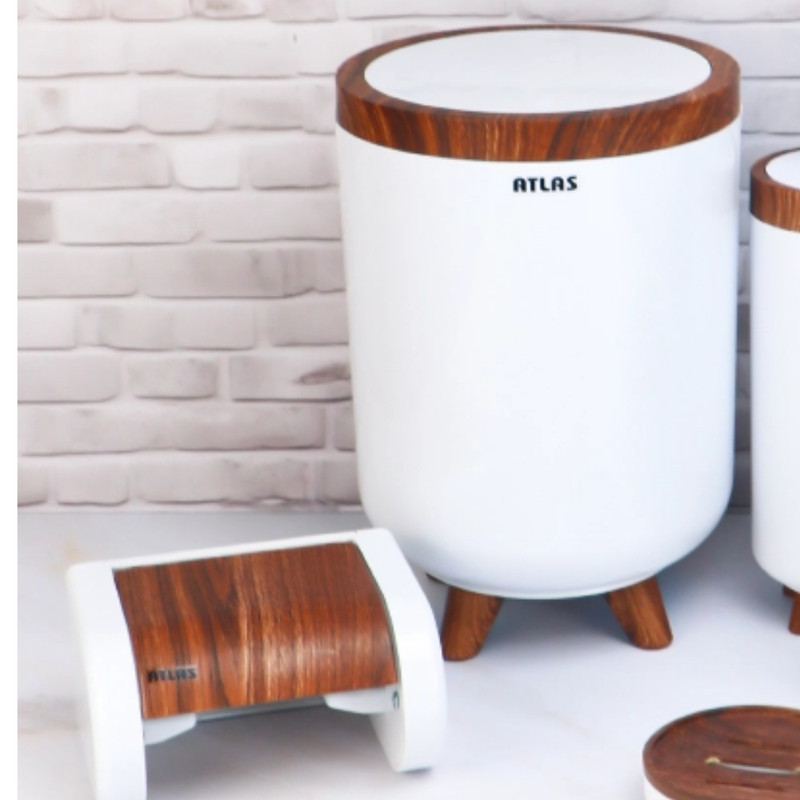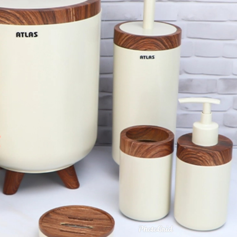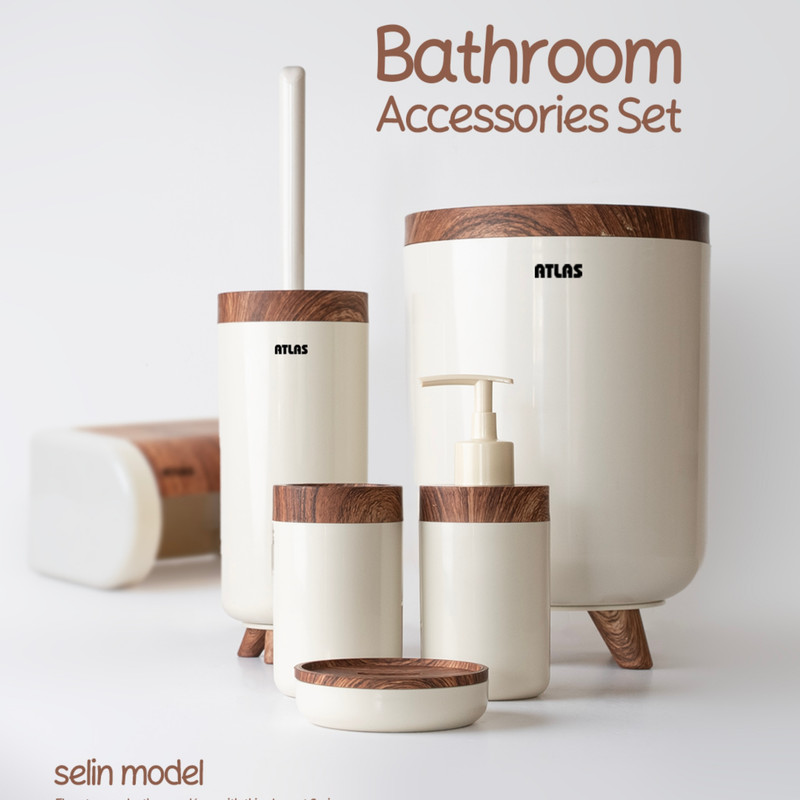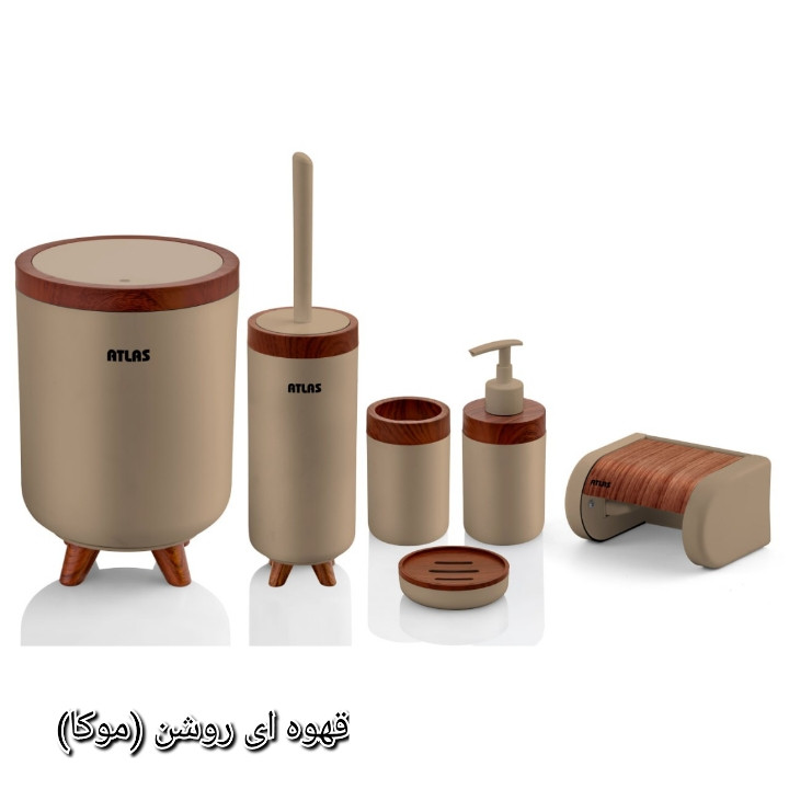 ست ۶ تکه اطلس مدل سلین طرح چوب تولید شده از مواد درجه یک و کاملا بهداشتی میباشد که شامل سطل و برس به همراه جا دستمال و جای صابون و مسواک و جای مایع میباشد ، این محصول در رنگ های مشکی ، طوسی ، سفید و وانیلی عرضه شده است