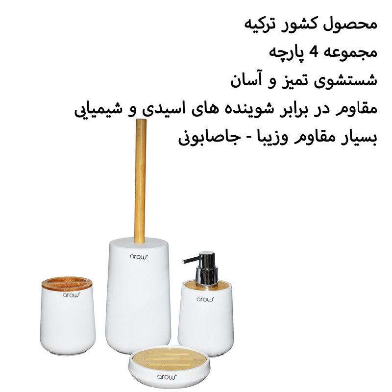 سایر توضیحات: محصول کشور ترکیه -مجموعه 4 پارچه - شستشوی تمیز و آسان - مقاوم در برابر شوینده های اسیدی و شیمیایی - بسیار مقاوم وزیبا - جاصابونی : ۱۱x۱۱x۳ سانتی متر - جامایع : 8x8x16 سانتی متر - جامسواکی : 8x8x10 سانتی متر - فرچه : 10x10x35سانتی متر