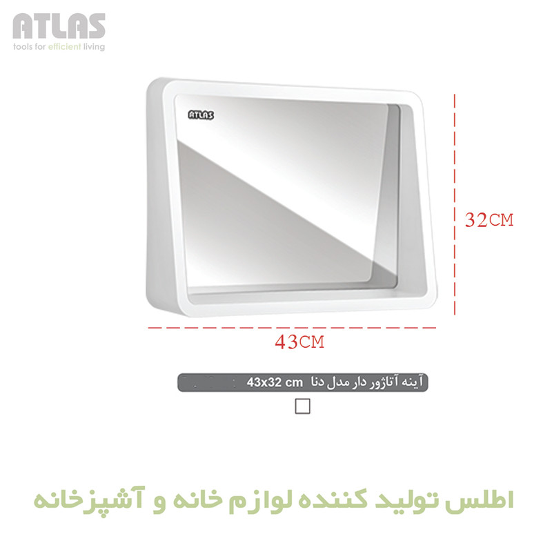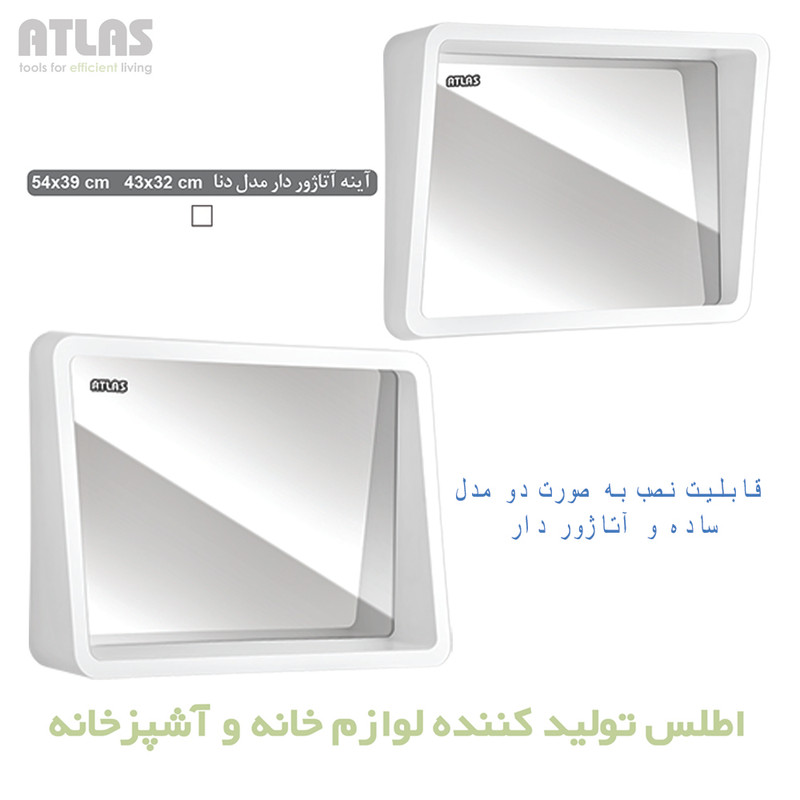 آینه اطلس مدل دنا دارای طراحی ساده و همراه با قابلیت آتاژور میباشد که بسیار کاربردی است و در دو سایز بزرگ : ۵۴x۳۹ سانتی متر و سایز کوچک : ۴۳x۳۱ سانتی متر تولید شده است همچنین هنگام نصب میتوانید در دوحالت انجام دهید هم اتاژور دار و هم ساده که سرویس شما رو زیبا میکند فریم این آینه از پلاستیک abs ئرجه یک ساخته شده و توسط لوین عرضه میشود