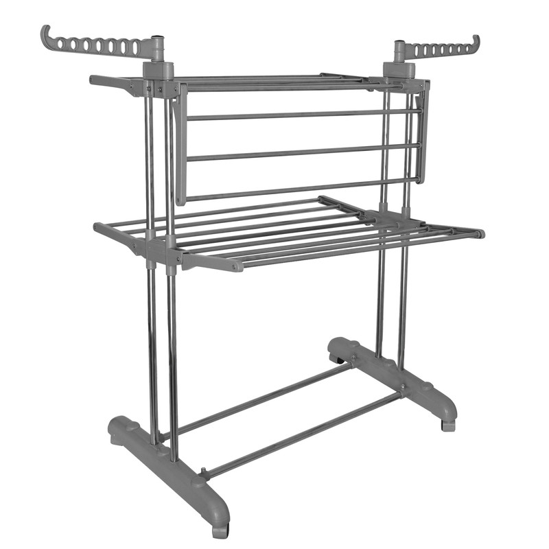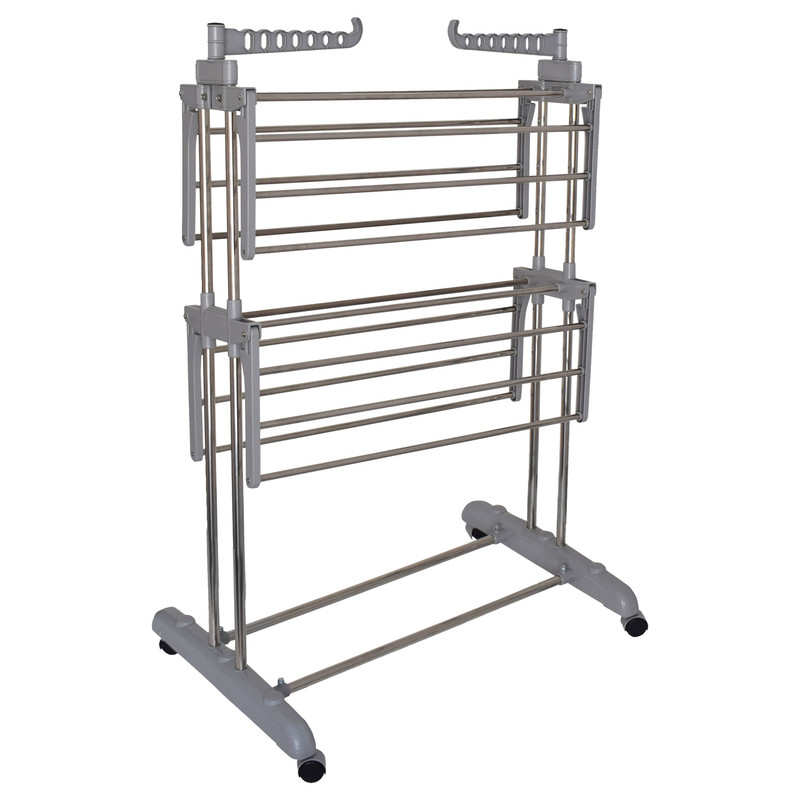 بند رخت چرخدار وِروُن محصولی با کیفیت بسیار بالا ساخت ایران است. به دلیل ساختار ایستاده، این بند رخت ظرفیتی حدود دو برابر بند رخت های تاشو معمولی، برای پهن کردن لباس در اختیار شما قرار می دهد و در عین حال فضای کمی از خانه شما (فقط 75x65 سانتیمتر در حالت باز شده) میگیرد. تاشو بودن طبقات و سهولت در جمع کردن طبقات یکی دیگر از مزایای بند رخت ورون است. دو رگال افقی بالای بند رخت، امکان آویزان کردن 14 چوب لباسی را در اختیار شما قرار می دهد که می توانید برای خشک کردن پیراهن ها، تیشرت و لباس های بلند در بهترین وضعیت، استفاده نمایید. یکی دیگر از مزیت های بند رخت چرخدار، جابجایی راحت بند تا کنار لباسشویی و انتقال بند پس از پهن کردن لباس ها به هرجای خانه مثل کار پنجره یا اتاق ها است. لوله های استفاده شده در ساخت بند رخت ورون از جنس با کیفیت ترین نوع Stainless steel است که در معرض رطوبت زنگ نمیزند، همچنین قطعات پلاستیکی جنس ABS و دارای مقاومت بسیار بالایی هستند. بند رخت ورون به دلیل طراحی دوبل پایه ها عمودی با قطر بالا از استحکام بسیار بالایی برخوردار است. در صورتی که دنبال یک محصول کاربردی با ظاهر زیبا، و کیفیت بالا هستید بندرخت ورون یک گزینه ایده آل برای شماست.