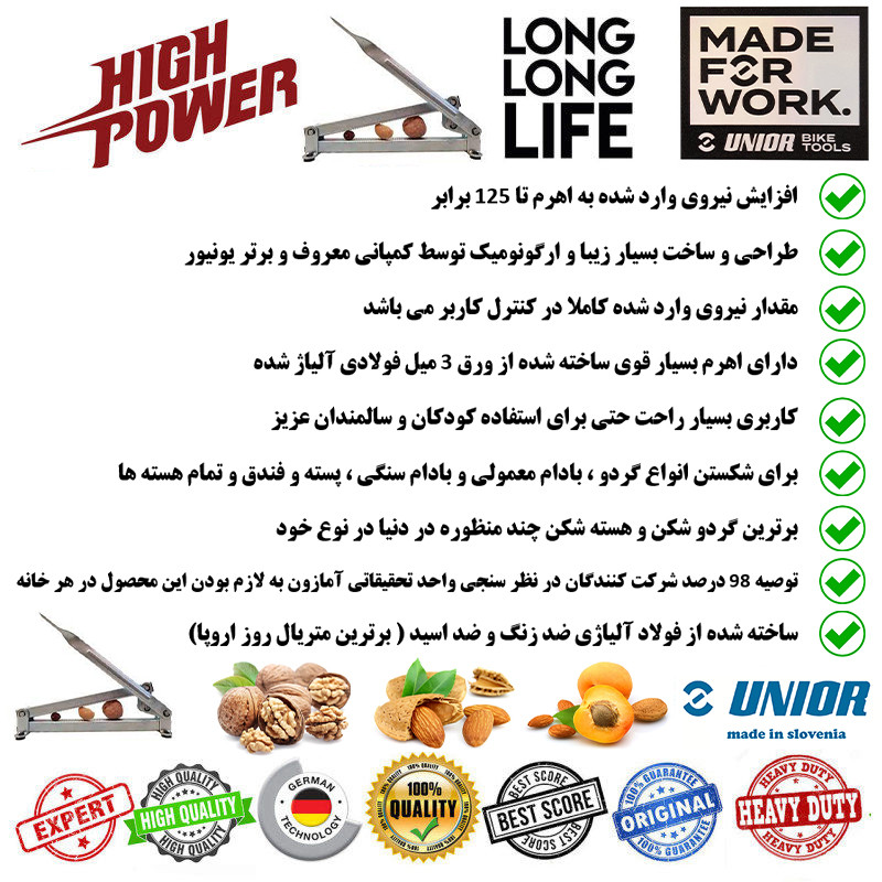 شاید بسیاری از مردم در دنیا کمپانی یونیور یوگسلاوی یا اسلوونی را برترین برند در زمینه تولید ابزار آلات صنعتی بدانند . ولی واقعیت این است که این شرکت در بیشتر زمینه های تولیدات مانند صنایع تولید فولاد (صنایع تولید فولاد یونیور اسلونی جز برترین صنایع تولید فولاد دنیا می باشد) و همچنین پزشکی نفت و گاز و بسیاری از صنایع با نام های تجاری دیگر جز برترین ها بوده است .یکی دیگر از زمینه های طراحی و تولیدی جدید این شرکت در زمینه ابزارهای کاربردی خانگیست. دستگاه هسته شکن چند منظوره یونیور ، برای شکستن پوست سخت انواع خشکبار ازجمله گردو، بادام، فندق، پسته دربسته و هسته زردآلو و بقیه هسته های نرم و سخت به کار میرود. جنس این محصول از فولاد ضد زنگ آبکاری شده به رنگ نقرهای است؛ به همین دلیل بسیار محکم، نشکن و ضد زنگ و خوردگی و اسید است. محصول به شکلی سبک، کمحجم و از لحاظ ارگونومی بسیار عالی طراحی شده است. قطعات کوچک و تیز و اضافه مثل پیچ و فنر و... ندارد و از این جهت برای کودکان بیخطر است. کار کردن با این محصول چندکاره، نیروی زیادی نمیخواهد و برای همین برای عزیزان سالخورده کار با این دستگاه به شدت راحت است. در این محصول، فاصله اهرمها هنگام بسته شدن بسیار فوق العاده طراحی شده است طوری که اگر انگشت زیر اهرم قرار بگیرد، آسیب نخواهد دید. این محصول بسیار زیبا کاملا بیصداست و شما با خیال راحت هر ساعت از شبانه روز در منازل آپارتمانی میتوانید از آن استفاده کنید . یونیور که همیشه در ساخت و طراحی ابزار های دستی در دنیا بهترین بوده بدون شک در تولید ابزار آلات خانگی هم کاملا بی رقیب در دنیا پیشقدم می باشد . ساخت و پردازش این هسته شکن در کشور آلمان و اسلونی صورت گرفته است . این دستگاه به گونه ای طراحی شده است که با اعمال نیروی مناسب، مانع از خرد شدن هسته میشود. تمام موارد کیفی و فنی این دستگاه باعث شده است که این محصول تولید شرکت یونیور در نوع خود در دنیا بیرقیب باشد .