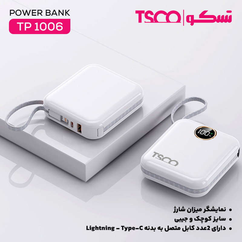 پاوربانک تسکو مدل TP 1006 راهکاری مطمئن برای مواقعی است که گوشی یا تبلت در طول روز به شارژ نیاز دارد؛ بهویژه در سفر، دانشگاه یا محل کار. این مدل با طراحی کوچک و جیبی، ظرفیت مناسب و امکانات کاربردی، برای کاربرانی که دائماً در حال تردد هستند طراحی شده است. ترکیب ابعاد فشرده، کابلهای متصل و پشتیبانی از شارژ سریع، تجربهای کاربردی از یک شارژر همراه ارائه میدهد.