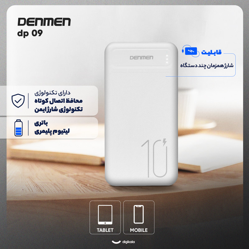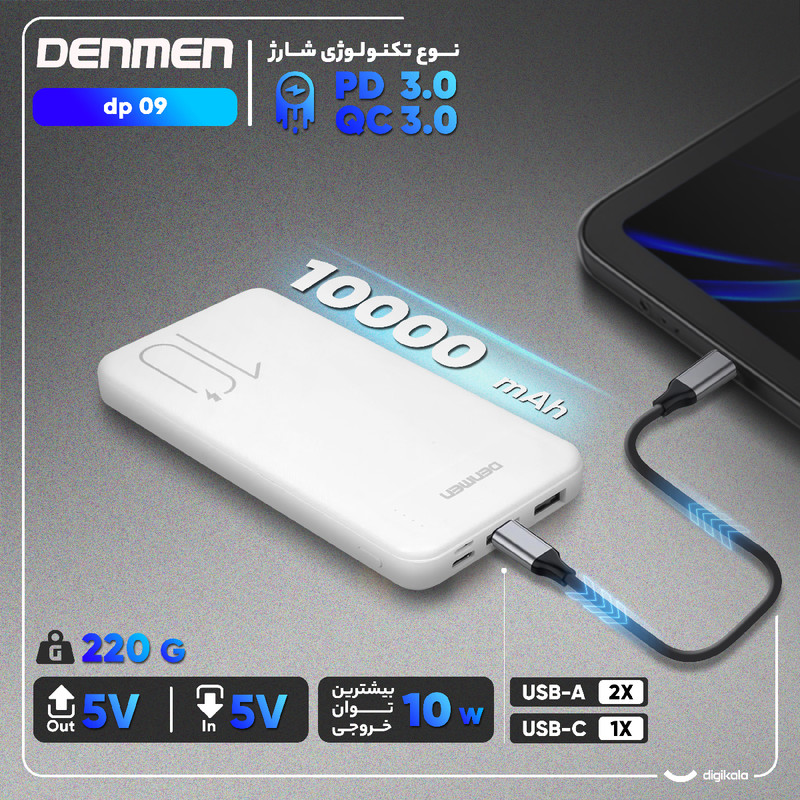 پاور بانک دنمن مدل DP09 یکی از بهترین گزینه ها برای جلوگیری از اتمام شارژ گوشی تلفن همراهتون، این مدل دارای ظرفیت 10000 میلی آمپر ساعت و مدت زمان شارژ طولانی است همچنین دارای 2 پورت USB برای شارژ وسایل شما، دارای نشانگر سطح شارژ LED (فعال سازی دکمه)، می توانید در هر زمان سطح شارژ را بررسی کنید. حفاظت چند سطحی در برابر اتصال کوتاه و گرمای بیش از حد، شارژ ایمن را تضمین می کندف بدنه این پاور بانک از مواد ضد حریق ساخته شده است. باتری پلیمری A+ با دوام و کم مصرف یکی از قابلیت های ویژه این پاوربانک است و همچنین قابلیت شارژ پاوربانک از طریق کانکتورهای Type-C و Micro USB میسر است.