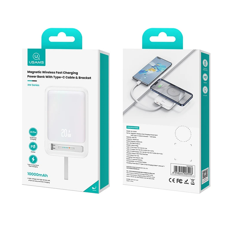 پاوربانک 10000 میلی آمپر مگنتی یوسمز مدل CD219 یک پاوربانک وایرلس 15 وات میباشد که به طور مغناطیسی به پشت آیفون های سری 12 به بعد و تمامی تلفنهای همراهی که قابلیت مغناطیسی دارند متصل میشود و به عمر باتری گوشی میافزاید. علاوه بر این هر تلفن همراهی هم که قابلیت مغناطیسی هم نداشته باشد ولی از وایرلس شارژ پشتیبانی کند هم میتواند از این این پاوربانک استفاده کند. پاوربانک وایرلس 15 وات یوسمز دارای مغناطیس بسیار قوی می باشد و به خوبی به تلفن همراه شما متصل میشود. در طراحی این پاوربانک یک قابلیت ویژه در نظر گرفته شده است که شما می توانید با باز کردن پایه کناری پاوربانک از آن به عنوان نگهدارنده موبایل هم استفاده کنید. ابعاد این پاوربانک 109x6.8x17.8 میلیمتر میباشد که بدون هیچ مشکلی به گوشی شما متصل شده، به طوری که هیچ تداخلی با دوربین گوشیهای آیفون 12 به بعد به وجود نمیآید. ظرفیت شارژر همراه یوسمز 10000 میلی آمپر میباشد.این پاوربانک علاوه بر شارژدهی به صورت وایرلس از طریق پورتهای دیگر آن میتوانید دستگاه خود را شارژ کنید. با پاوربانک 10 هزار یوسمز مدل US-CD219 می توانید از 3 طریق دستگاه های خود را شارژ کنید.اولین راه از طریق قسمت مگنتی این پاوربانک می باشد که با قدرت حداکثر 15 وات تلفن همراه شما را شارژ میکند.علاوه بر آن یک پورت تایپ سی هم بر روی آن تعبیه شده که می توانید با قدرت حداکثر 20 وات تلفن همراه خود را شارژ کنید.یکی از راه های شارژ دیگر این پاور بانک که شما را تقریبا از کابل شارژ اضافی بی نیاز میکند کابل شارژ تایپ سی متصل به آن می باشد که گوشی شما را با قدرت حداکثر 22.5 وات شارژ می کند. پاوربانک وایرلس یوسمز با وزن حدود 200 گرمی خود و با توجه به ظرفیت 10000 میلی آمپری که دارد یک پاوربانک فوق العاد خوش دست می باشد. همچنین این پاوربانک از فناوری شارژ سریع PD و QC پشتیبانی میکند.