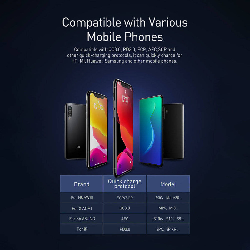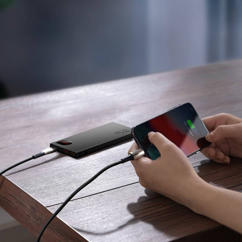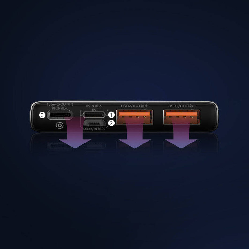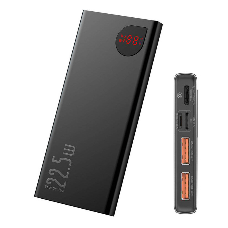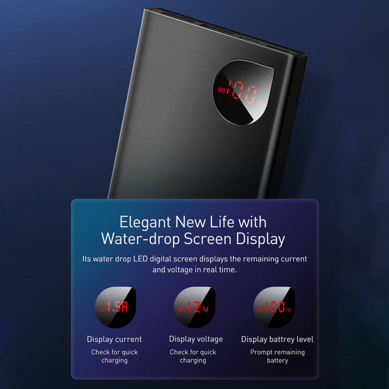 پاوربانک باسئوس Baseus PPAD000001 Adaman Metal Digital Display Quick Charge 5A 2021 Edition PPADM10S دارای سه پورت خروجی است که دوتای آن USB بوده که به شما این امکان را میدهد تا بتوانید دو گوشی را با شدت جریان و ولتاژ 5V-3A شارژ کنید. همچنین این پاوربانک دارای یک پورت تایپ سی است که هم به عنوان یک ورودی و هم خروجی استفاده میشود. این محصول دارای سه پورت ورودی بوده که شامل پورتهای میکرو یو اس بی، لایتنینگ و تایپ سی میباشد و باعث شده تا بتوانید به راحتی با تمامی این کابل ها این پاوربانک را شارژ کنید. ظرفیت اسمی پاوربانک فست شارژ باسئوس Adaman برابر با 10000 میلی آمپر ساعت و ظرفیت واقعی آن 5800 میلی آمپر ساعت است. هر کدام از پورتهایی که گفتیم قادرند توان مشخصی را به شما بدهند. شدت جریان، ولتاژ و توان خروجی هر کدام از پورتهای این پاوربانک عبارت است از: پورت های یو اس بی خروجی: 4.5V/5A (SCP) - 5V/4.5A - 5V/3A - 9V/2A - 12V/1.5A؛ پورت تایپ سی خروجی: 5V/3A - 9V/2.22A - 12V/1.5A؛ پورت یو اس بی 1 + یو اس بی 2: جمعا 5V/3A؛ پورت یو اس بی 1 یا 2 + تایپ سی خروجی: جمعا 5V/3A؛ پورت یو اس بی 1 + یو اس بی 2 + تایپ سی: جمعا 5V/3A؛ پورت تایپ سی ورودی: 5V/3A - 5.5V/3A - 9V/2A؛ پورت میکرو یو اس بی ورودی: 5V/2A - 9V/2A؛ پورت لایتنینگ ورودی: 5V/2A - 9V/2A. این پاوربانک مجهز به یک چیپست هوشمند میباشد که قادر است از باتری گوشی شما در برابر نوسانات و اتصالات کوتاه محافظت کند به گونهای که شدت جریان خروجی از پاوربانک را با شدت جریان ورودی گوشی شما یکسان میکند تا هیچ گونه آسیبی به باتری گوشی شما وارد نشود. پورت های USB این محصول مجهز به فناوری QC 3.0 بوده که از گوشی شما هم دارای این فناوری باشد میتوانید با سرعت بسیار بالا گوشی موبایل خود را شارژ کنید. پورت Type-C هم از فناوری PD برخودار است که به شما امکان شارژ دستگاههایی غیر از گوشی موبایل که در رنج توان این پاوربانک قرار دارند را میدهد. در نگاه اول به این محصول نظر شما به سمت نمایشگر LCD این محصول جلب میشود زیرا طراحی بسیار زیبایی داشته و قادر است میزان شدت جریان، ولتاژ و ظرفیت را به شما نشان دهد. بدنه پاوربانک BASEUS Adaman از پلاستیک ABS و متریال PC بوده که از مقاومت بالایی در برابر خط و خش و ضربه و حرارت دارد.