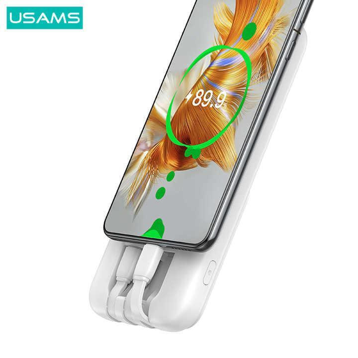کابلهای همراه این پاوربانک از نوع لایتنینگ (5V-2A)، تایپ سی (5V-2A) و میکرو (5V-2A) میباشد.شارژر همراه یوسمز مدل CD194 علاوه بر کابلهای متصل دارای دو خروجی است که یکی از آن ها پورت USB بوده و به شما این امکان را میدهد تا بتوانید گوشی خود را با شدت جریان و ولتاژ (5V-2A) شارژ کنید و دیگر خروجی پاوربانک 10 هزار usams پورت تایپ سی است که هم بعنوان ورودی برای شارژ پاوربانک و هم خروجی استفاده میشود و با شدت جریان و ولتاژ (5V-2A) گوشی خود را شارژ کنید.
