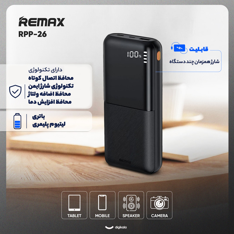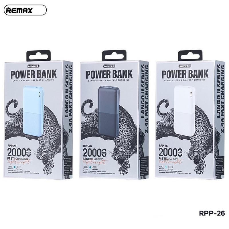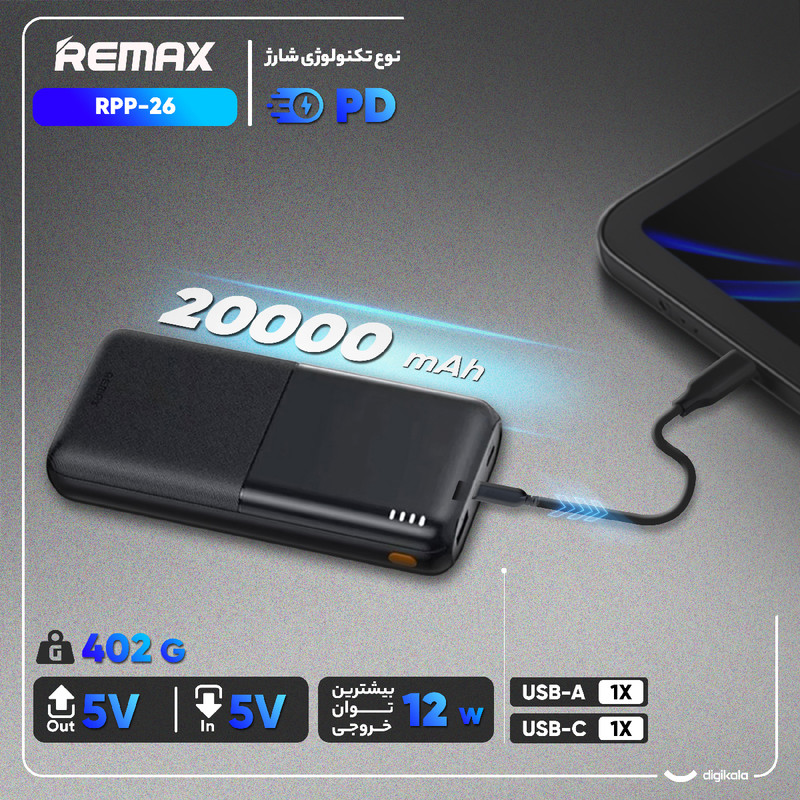 پاوربانک 12 وات ریمکس مدل RPP-26 ظرفیت 20000 میلی آمپر ساعت