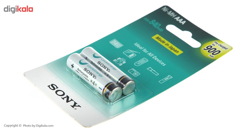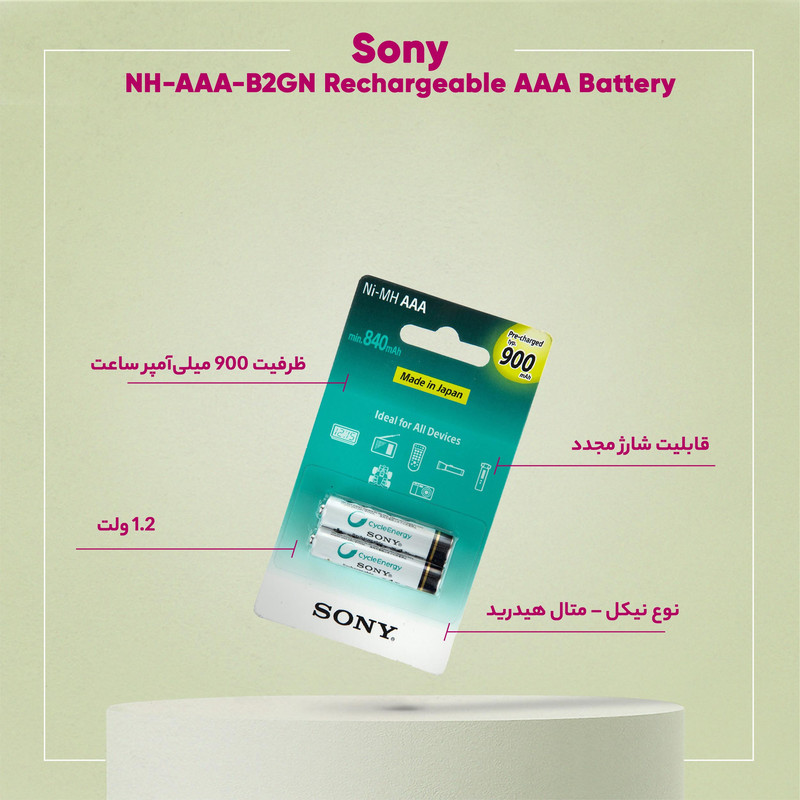 باتری «NH-AAA-B2GN» محصولی از برند «سونی» (Sony) است. در این محصول، 2 عدد باتری نیمقلمی از نوع قابل شارژ قرار دارد و میتوان آنها را پس از تخلیه بهوسیلهی شارژر مجددا شارژ کرد. خود شرکت سازنده، شارژرهای خاصی را برای این کار تولید کرده است؛ البته میتوان از شارژرهای سایر برندها هم برای این کار استفاده کرد. نوع فناوری بهکاررفته در این باتریها «نیکل – متال هیدرید» (Ni – MH) است و ظرفیت نامی هریک از آنها 900 میلیآمپر ساعت اعلام شده است. باتریهای نیکل–متال هیدرید در مقایسه با باتری آلکالاین، سه برابر قدرت بیشتری دارند و در دستگاههای High Drain عملکرد بهتری از خود نشان میدهند. خود شرکت سازنده این باتریها را به صورت ازپیششارژشده میفروشد و میتوانید بلافاصله پس از بازکردن بستهبندی، از باتریها استفاده کنید. حداقل ظرفیتی که باتریها ارائه میکنند، 840 میلیآمپر ساعت است. باتری NH-AAA-B2GN برای استفاده در دستگاههایی مانند دوربین عکاسی، چراغ قوه و وسایلی از این قبیل که به قدرت زیادی نیاز دارند، طراحی شده است. استفاده از باتریهای قابل شارژ برای اسباببازیهای کودک که مرتبا باتری مصرف میکنند، بسیار مناسب است.