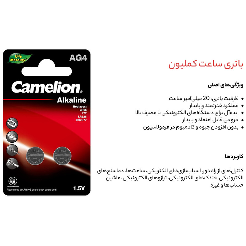 باتری کملیون مدل lr626 با ابعاد 6.8 در 2.6 میلی متر مخصوص بعضی از ساعت ها میباشد و دارای تکنولوژی آلکالاین میباشد و بدون جیوه بوده این بسته شامل 2 عدد میباشد.
