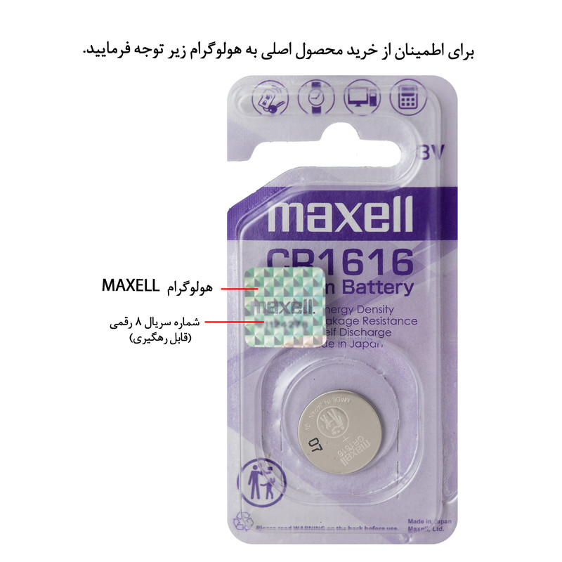 یکی از مهمترین دلیل خرید باتری سکه ای مکسل مدل CR 1616 کیفیت، توان واقعی، ماندگاری و عملکرد باتری اصلی می باشد. از همین رو شرکت مکسل برای تشخیص محصول اصل از غیر اصل، اقدام به نصب هولوگرام با شماره سریال 8 رقمی بر روی بسته بندی باتری نموده است که در زمان خرید برای اطمینان از اصل بودن باتری به هولوگرام که تصویر آن در سایت موجود است توجه فرمایید. از ویژگی های باتری سکه ای مکسل مدل CR 1616 می توان به تکنولوژی جهت ساخت با استفاده از مواد لیتیومی (باتری سکه ای لیتیومی) و 3 ولت جریان خروجی واقعی اشاره کرد. باتری لیتیومی سکه ای مکسل را می توانید به عنوان یک باطری سکه ای ژاپنی، با کیفیت ساخت بالا، جریان خروجی یکنواخت، ماندگاری در طولانی مدت و به دلیل مواد استفاده شده در ساخت در این نوع از باتری سکه ای به عنوان دوستدار محیط زیست، معرفی نمود.