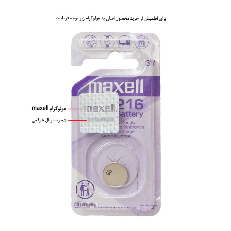 یکی از مهمترین دلیل خرید باتری سکه ای مکسل مدل CR1216 کیفیت، توان واقعی، ماندگاری و عملکرد باتری اصلی می باشد. از همین رو شرکت فیلیپس برای تشخیص محصول اصل از غیر اصل، اقدام به نصب هولوگرام با شماره سریال 8 رقمی بر روی بسته بندی باتری نموده است که در زمان خرید برای اطمینان از اصل بودن باتری به هولوگرام که تصویر آن در سایت موجود است توجه فرمایید. از ویژگی های باتری سکه ای مکسل مدل CR-1216 می توان به تکنولوژی جهت ساخت با استفاده از مواد لیتیومی (باتری سکه ای لیتیومی) و 3 ولت جریان خروجی واقعی اشاره کرد. باتری لیتیومی سکه ای مکسل را می توانید به عنوان یک باطری سکه ای ژاپنی، با کیفیت ساخت بالا، جریان خروجی یکنواخت، ماندگاری در طولانی مدت و به دلیل مواد استفاده شده در ساخت در این نوع از باتری سکه ای به عنوان دوستدار محیط زیست، معرفی نمود.