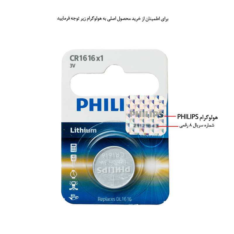 یکی از مهمترین دلیل خرید باتری سکه ای فیلیپس مدل CR1616 کیفیت، توان واقعی، ماندگاری و عملکرد باتری اصلی می باشد. از همین رو شرکت فیلیپس برای تشخیص محصول اصل از غیر اصل، اقدام به نصب هولوگرام با شماره سریال 8 رقمی بر روی بسته بندی باتری نموده است که در زمان خرید برای اطمینان از اصل بودن باتری به هولوگرام که تصویر آن در سایت موجود است توجه فرمایید. تکنولوژی ساختی که در تولید این نوع باتری به کار رفته ، لیتیومی بوده و دارای پایداری انرژی الکتریکی و عمر مفید است. قابلیت شارژ مجدد ندارد، پس طبیعتا نمیتوان پس از اتمام انرژی الکتریکی دوباره آن را شارژ و استفاده کرد. باتری سکهای فیلیپس گزینهای مناسب برای تامین انرژی الکتریکی وسایلی مانند ساعت ، ریموت ها ، اسباب بازی ها و دیگر دستگاههایی است که انرژی مورد نیازشان را از باتریهای سکهای تامین میکنند. باتری های اصلی فیلیپس بسیار قابل اعتماد و با کیفیت می باشند.