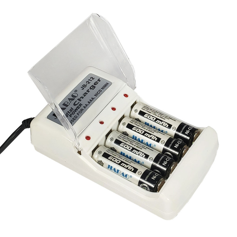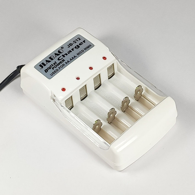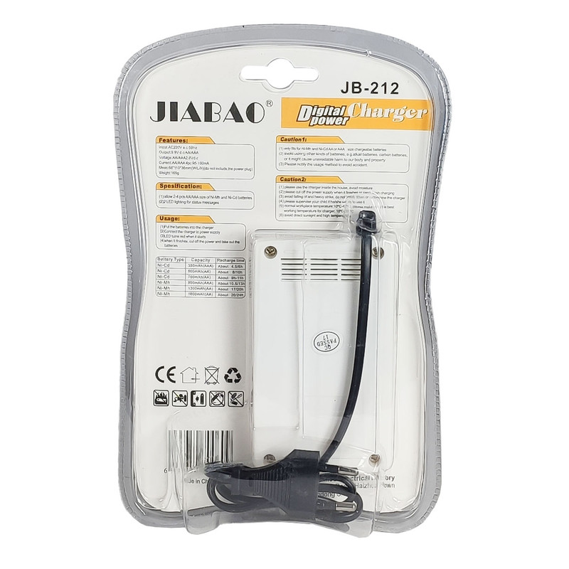 شارژر باتری جیابائو JIABAO از انواع شارژر های مناسب برای شارژ باتری 1.2 ولتی قلمی و نیم قلمی از نوع نیکل کادمیوم و یا نیکل متال هیدرید محسوب می شود.این شارژر با دارا بودن یک عدد ترانسفورماتور ایزوله جریان و ولتاژ اولیه را که از برق 220 ولت شهری فراهم می شود کنترل کرده و شارژ را با جریان مناسب انجام می دهد. در بالای محل قرار گیری هر باتری یک چراغ ال ای دی قرار داده شده است تا با روشن شدن آن اطمینان از عمل شارژ انجام شود مدت زمان شارژ برای باتری 600 میلی آمپر که به همراه یک دستگاه اراِه می شود حدود 8 ساعت است.این شارژر امکان قطع خودکار را نداشته و بعد از مدت زمان مناسب برای شارژ ، می توان باتری را از دستگاه با حصول اطمینان از کامل شدن شارژ، خارج کرد.