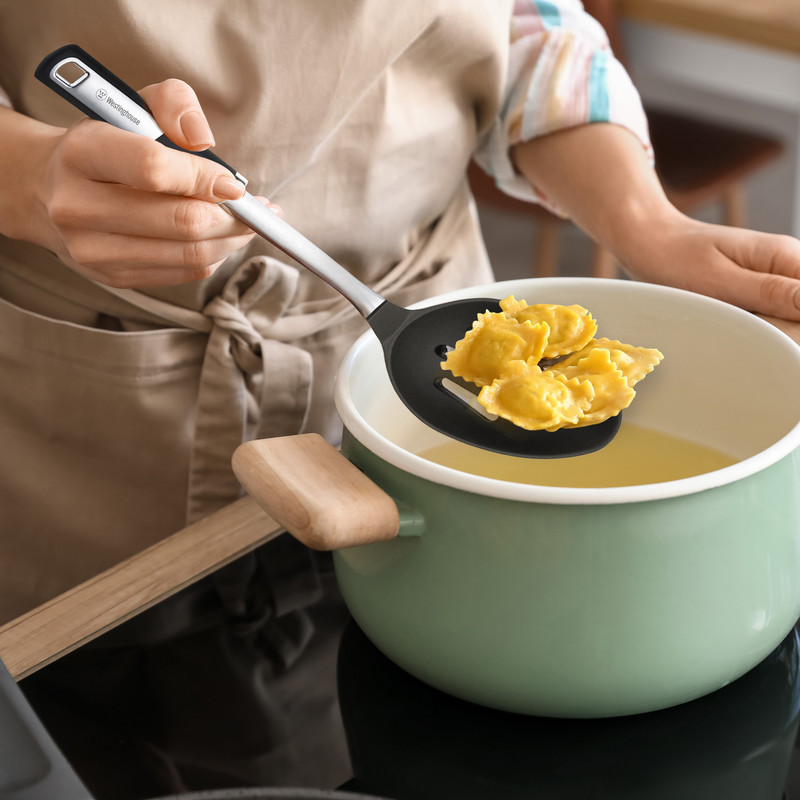 کفگیر شیاردار نایلونی وستینگهاوس مدل WCKT0081011 یک ابزار کاربردی و حرفهای برای آشپزی روزمره است که مخصوص همزدن، برداشتن و سرو انواع غذا از داخل قابلمه و تابه طراحی شده است. سر این کفگیر از نایلون باکیفیت و مقاوم در برابر حرارت ساخته شده و به همین دلیل هنگام استفاده در ظروف نچسب مثل تفلون، سرامیک و گرانیت هیچ خط و خشی ایجاد نمیکند. اگر برای سالم نگهداشتن روکش ظروف نچسب حساس هستید، این ابزار یکی از بهترین انتخابها برای شماست.