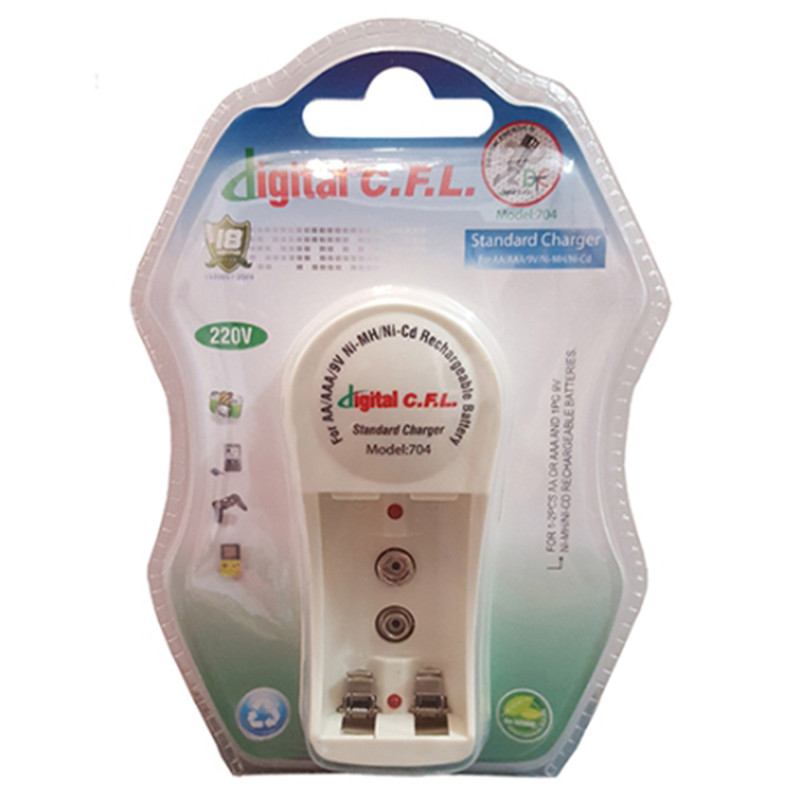 شارژر چند کاره مارک Digital CFL چهار تایی باتری های قلمی AA ، نیم قلمی AAA ، کتابی 9V است. شارژر باتری قلمی و نیم قلمی و کتابی دوتایی CFL و مناسب برای باتری های نیکل - متال هیدرید (Ni-MH) و نیکل - کادمیوم (Ni-Cd) و قابلیت شارژ همزمان 1 یا 2 باتری قلمی یا نیم قلمی را دارد. ولتاژ ورودی100 الی 240 ولت AC با فرکانس 50 یا 60 هرتز و ولتاژ خروجی 1.4 ولت DC با 120 میلی آمپر می باشد.