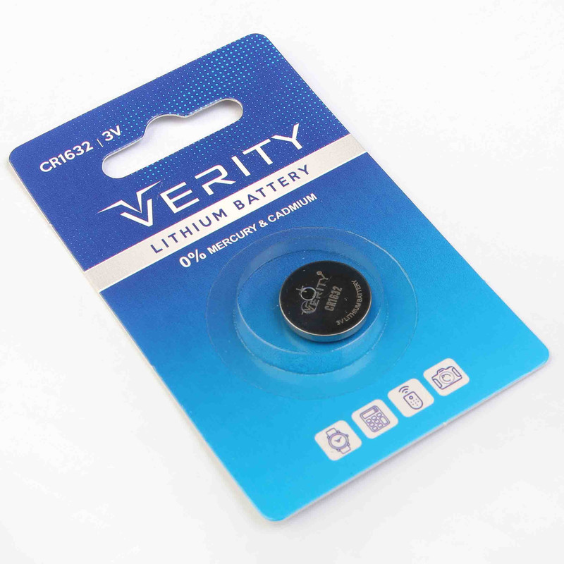 باتری CR1632 وریتی دارای قطری به اندازه 16 میلی متر و و ضخامت 3.2 میلی متر میباشد.این باتری دارای تکنولوژی لیتیومی میباشد .