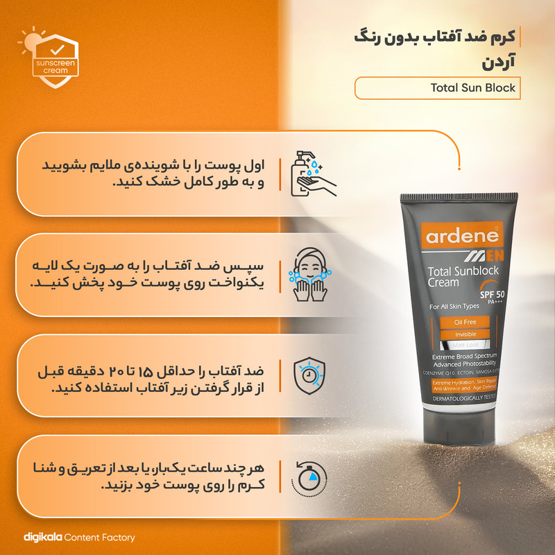 راهنمای استفاده : 20 دقیقه قبل از قرار گرفتن در معرض تابش نور خورشید مقدار کافی از کرم ضد آفتاب چند کاره آقایان آردن را به طور یکنواخت بر روی سطح پوست بمالید و به خوبی ماساژ دهید.