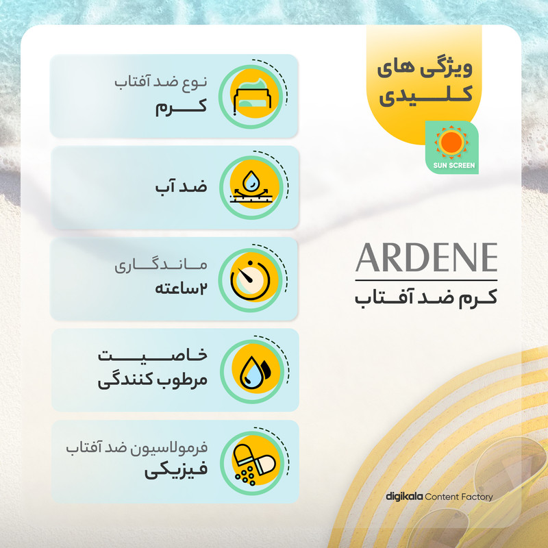 ویژگیهای ضدآفتاب : ضد آب , محافظت کننده در برابر اشعه UVA , محافظت کننده در برابر اشعه UVB , مرطوب کننده