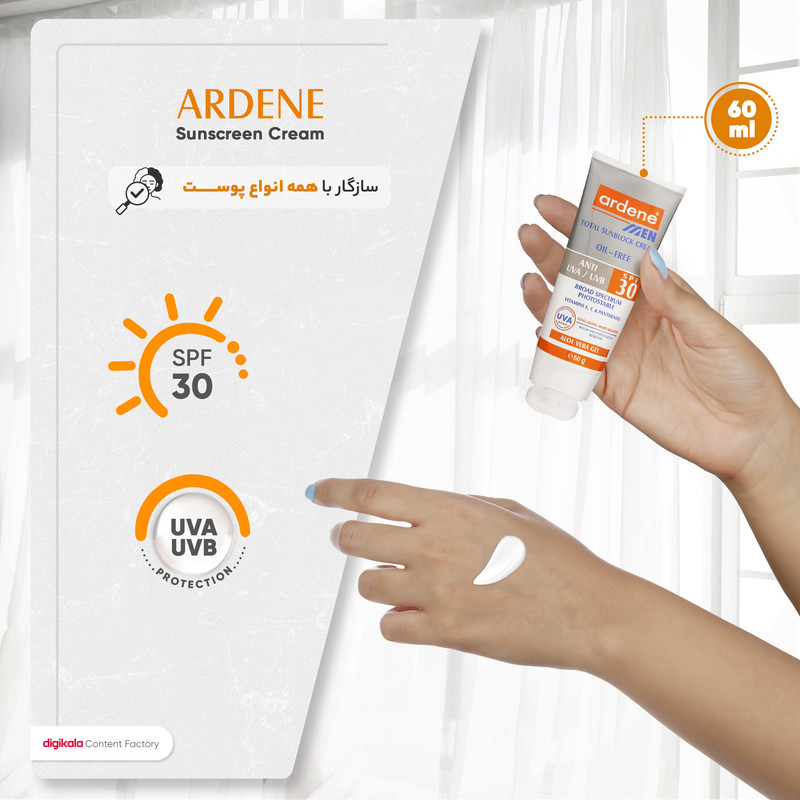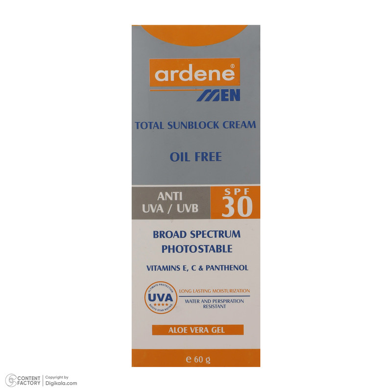 کرم ضد آفتاب بدون رنگ آقایان آردن با SPF30 مناسب آقایان است. این محصول با توجه به تفاوتهای اساسی فیزیولوژیکی که بین پوست آقایان و خانمها وجود دارد، برای اولین بار در ایران طراحی و تولید گردیده است. این ضدآفتاب فاقد روغنهای معدنی و ترکیبات چرب بوده از همین رو بدون اثر سفید کنندگی و براقیت بر روی پوست، قدرت حفاظتی کامل در تمام طول موجهای پرتوی ماوراء بنفش دارد. این ضد آفتاب 50 گرمی دارای مواد مرطوب کننده مؤثر پوست بوده و در برابر نور و تعریق مقاوم است. همچنین حاوی ژل آلوئه ورا جهت التیام بخشی و ترمیم پوست بوده و با وجود ویتامین C و E بعنوان یک آنتی اکسیدان قوی و محافظ در برابر تشکیل رادیکالهای آزاد روی پوست عمل میکند. از آنجاییکه پوست آقایان ضخیمتر از پوست خانمهاست، این ضدآفتاب اثر نفوذپذیری بیشتری به پوست داشته و به همین دلیل هم بهتر است که خانمها از این محصول استفاده نکنند؛ چرا که در صورت نازک و یا حساس بودن احتمال اثرگذاری منفی روی پوست وجود خواهد داشت.