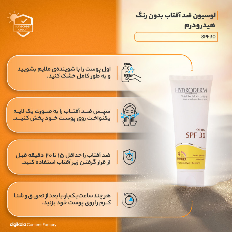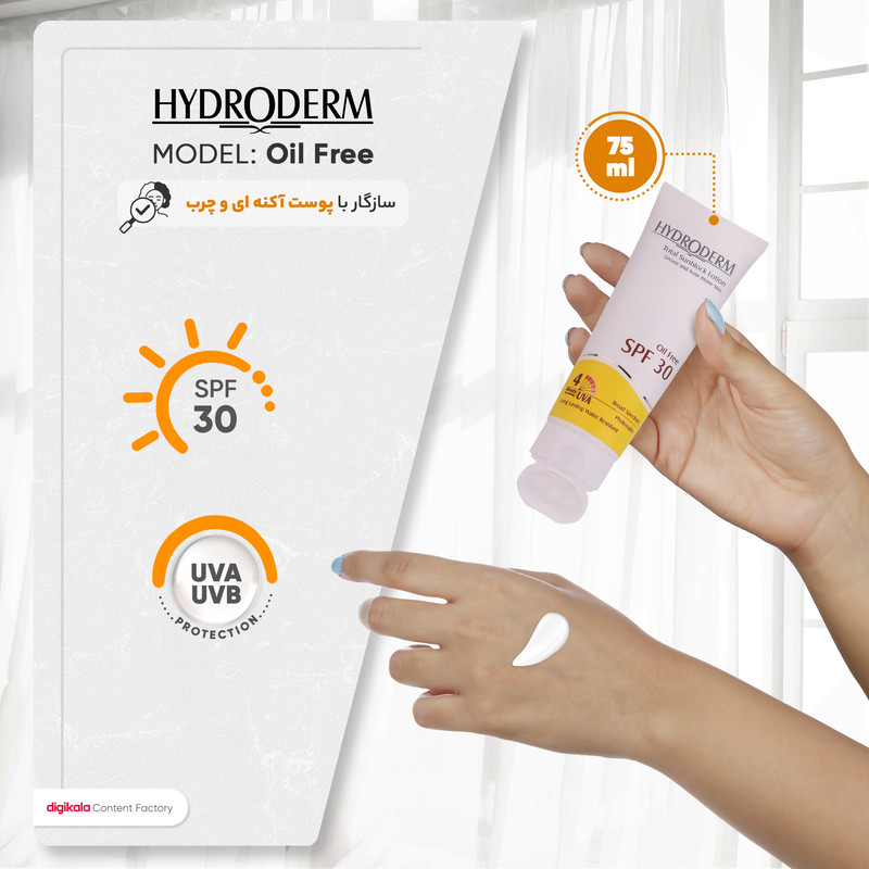 لوسیون ضدآفتاب هیدرودرم با SPF 30 یک انتخاب هوشمندانه برای کسانی است که به دنبال محافظتی کارآمد و طبیعی در برابر اشعههای مضر خورشید هستند. این لوسیون با فرمولاسیون خاص خود بهطور موثر از پوست در برابر اشعههای UVA و UVB محافظت میکند. SPF 30 به معنای توانایی لوسیون در کاهش آسیبهای پوستی ناشی از نور خورشید است که میتواند از بروز پیری زودرس، لکههای پوستی و خطرات جدیتری مانند سرطان پوست جلوگیری کند. ویژگی فاقد چربی بودن این لوسیون، آن را برای پوستهای چرب و آکنهای بسیار مناسب میسازد. بسیاری از افراد با پوستهای چرب در جستجوی محصولاتی هستند که علاوه بر محافظت از پوست، باعث ایجاد احساس چربی یا براقی نشوند. لوسیون ضدآفتاب هیدرودرم با فرمولاسیون سبک خود، این نیاز را برآورده کرده و به کنترل چربی پوست کمک میکند.